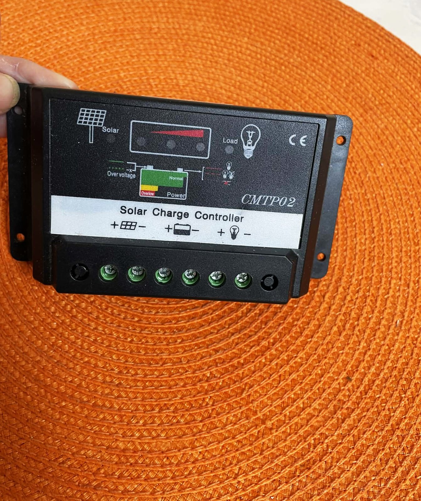 Na zariadení sú indikačné LED diódy pre stav solárneho panelu (Solar) a záťaže (Load).