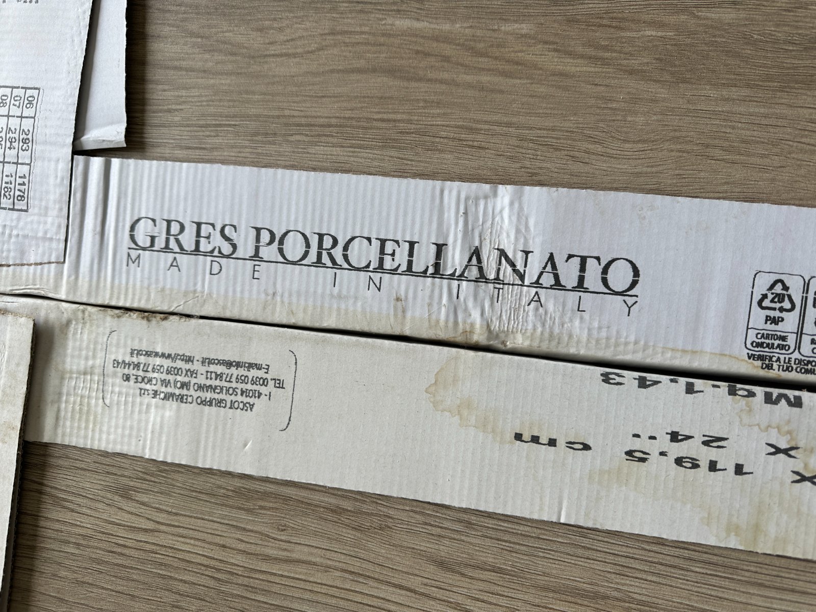 Rozmer: 120x30 cm, zn. Ascot (Taliansko), vzor dreva, farba hnedá, 3,5 bal. x 4 ks. 1 bal. = 1,43 m2, celkom 14 ks/5 m2.