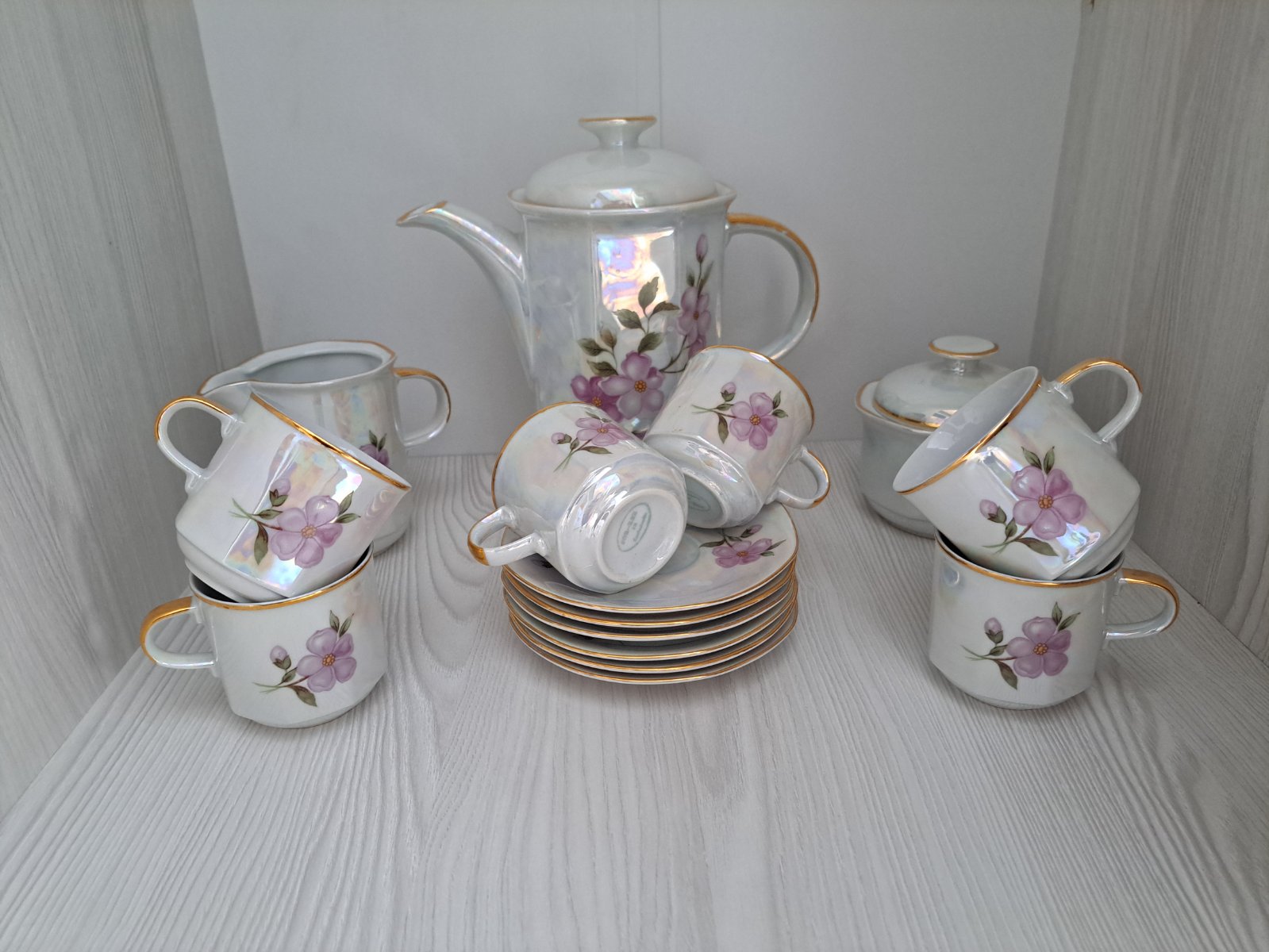 Perleťový kávový set. 6 šálok, 6 tanierikov, cukornička, mliečnik, čajník . Dohoda možná