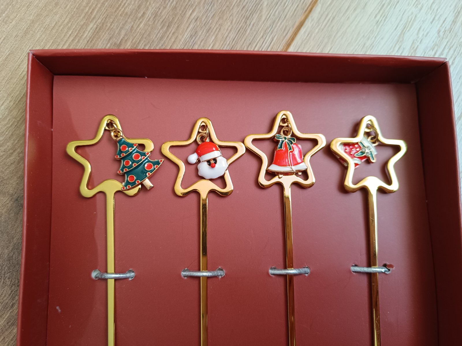 Vidlicky su vyrobene z kovu v zlatej farbe s farebnymi priveskami s temou Vianoc.