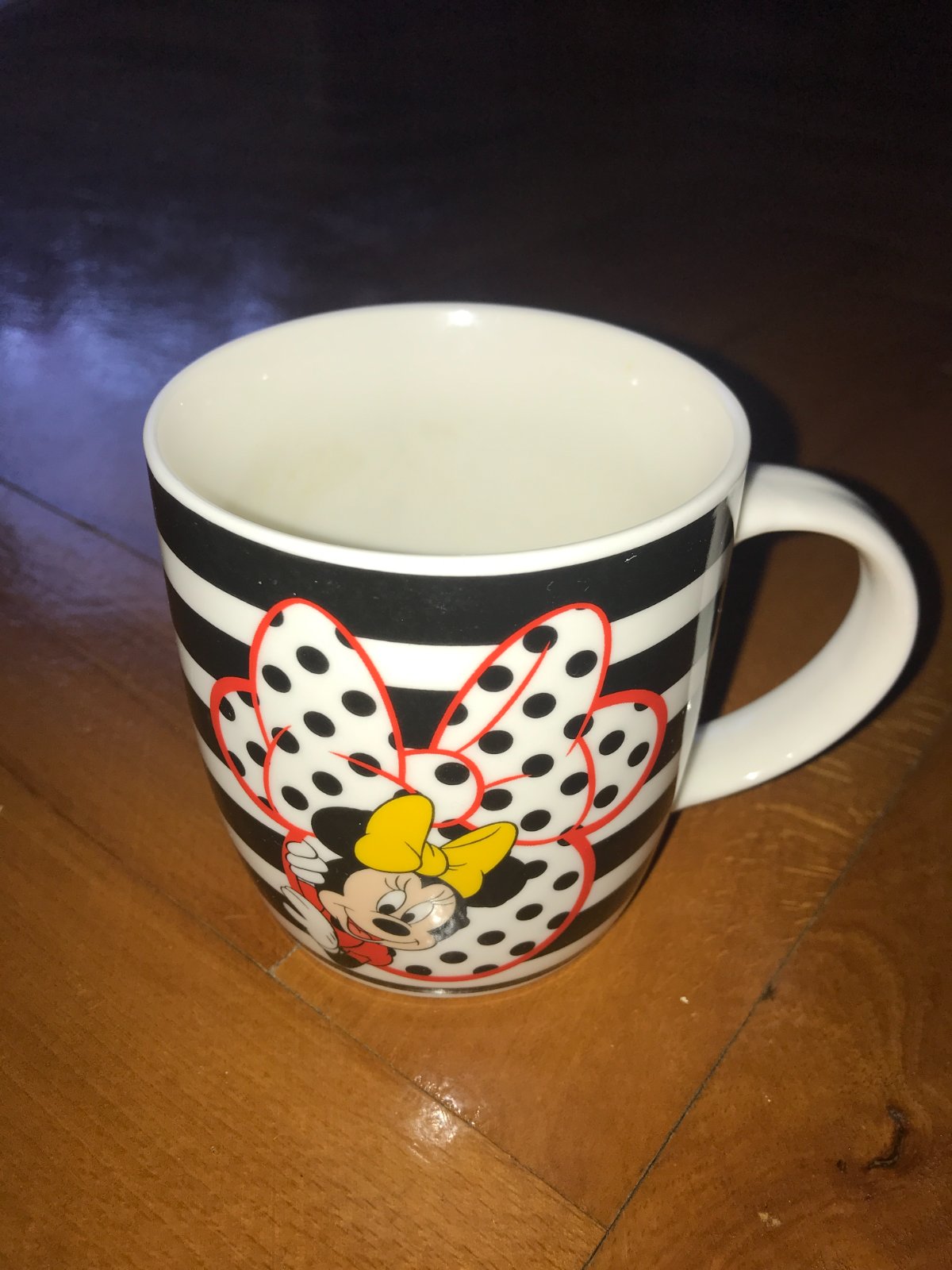Minnie Mouse s veľkou mašľou, čierno-biele pruhy, červený nápis „Minnie“