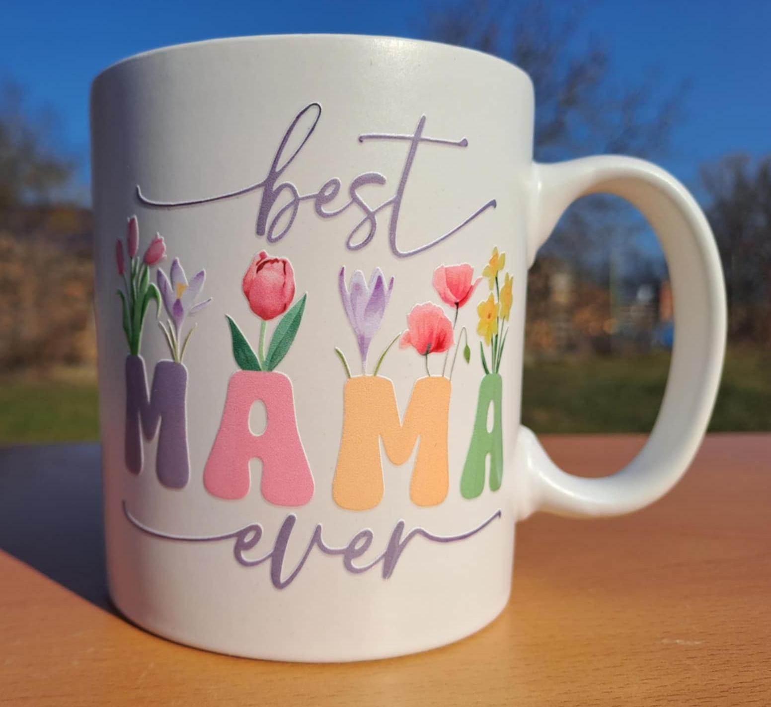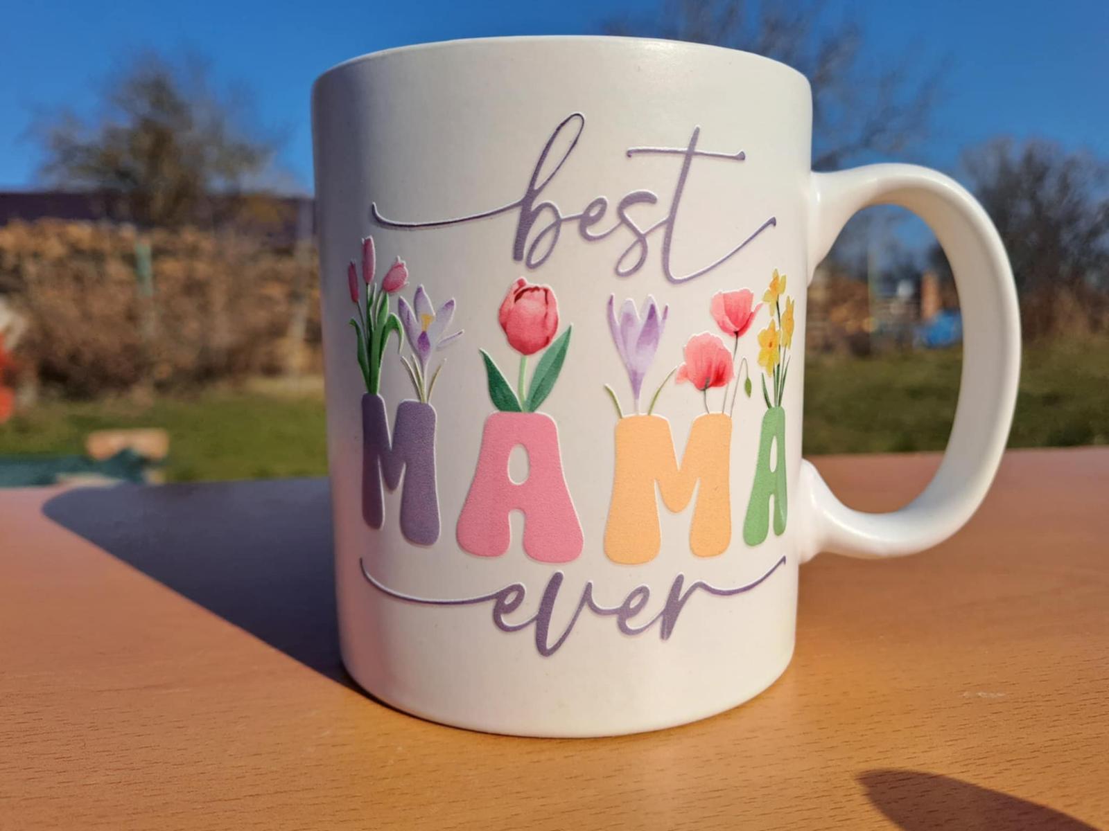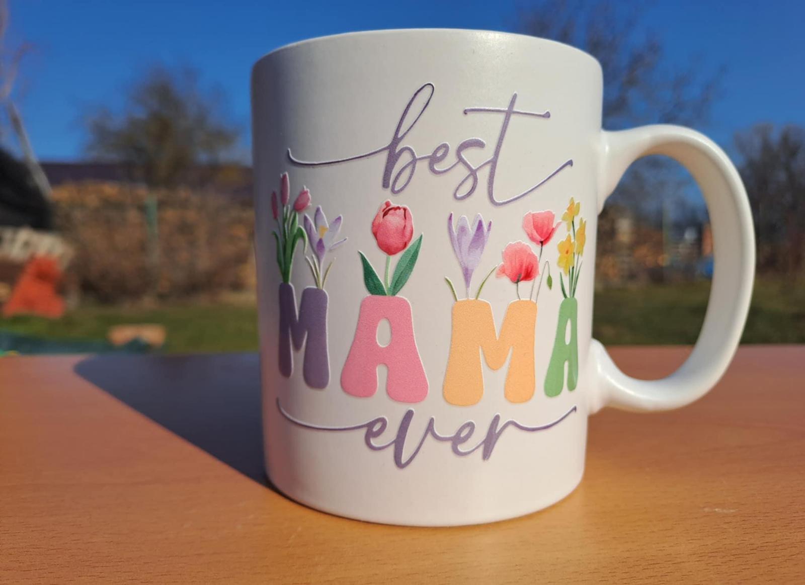Originálny keramický hrnček bielej farby s motívom nápisu Best mama ever (Najlepšia mama na svete) a kvetov.