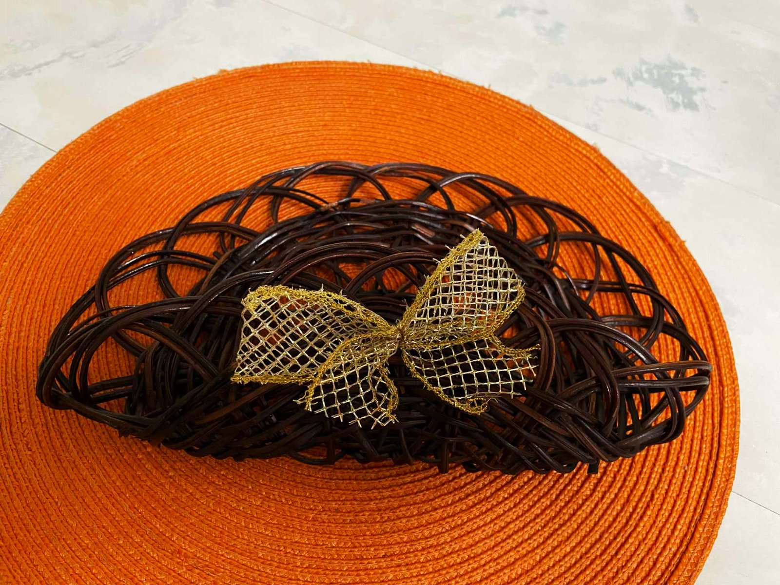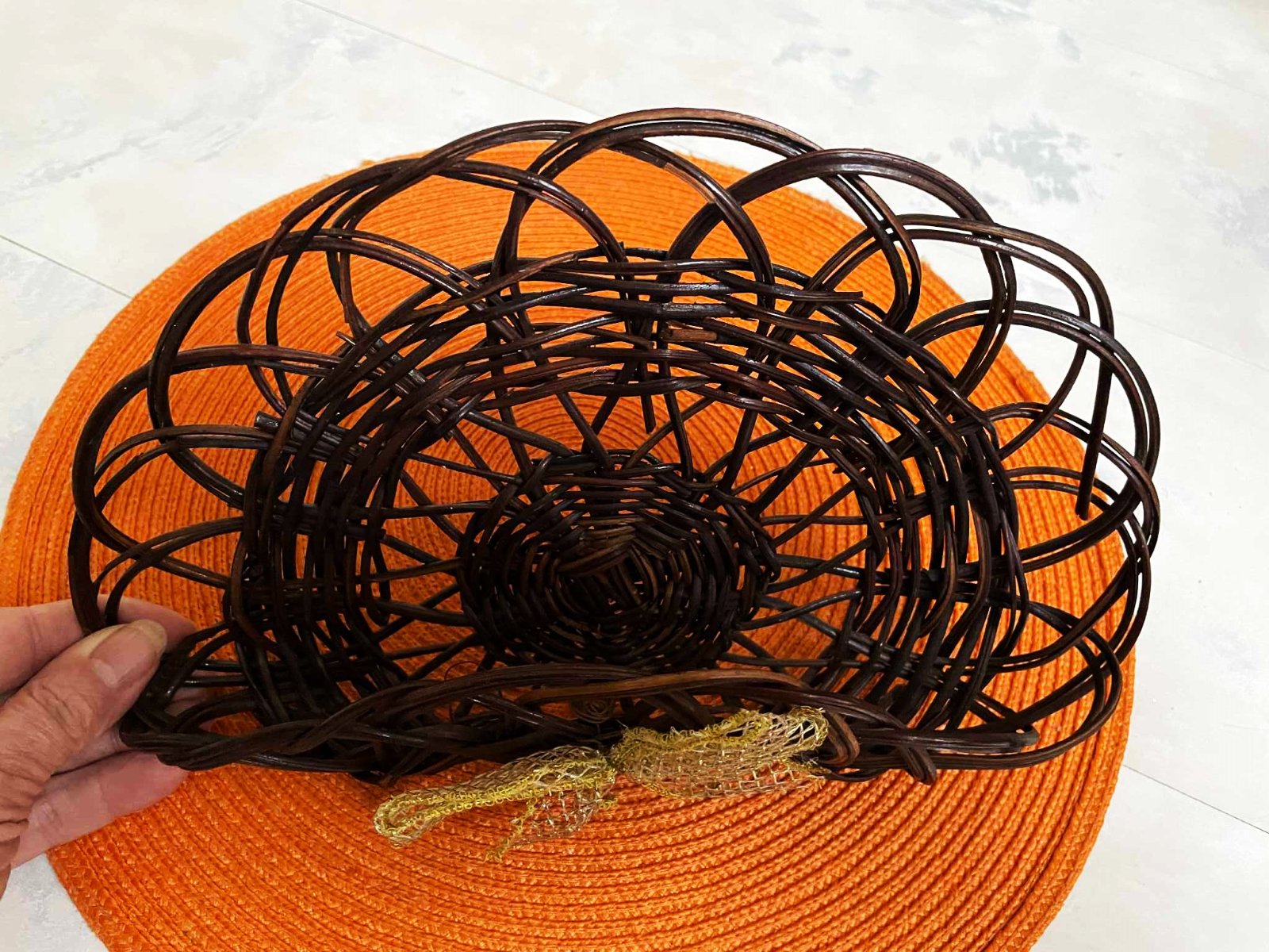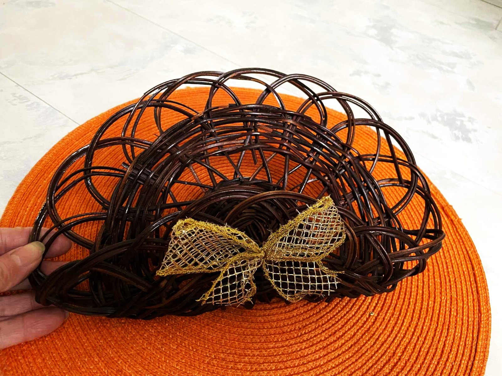 zaujímavý prútený doplnok na zavesenie,dá sa aj ozdobiť a vyplniť podľa vlastnej fantázie,buď vianočnými ozdobami,veľkonočnými alebo jesenným lístím a konárikmi,vpredu mašla,ktorá sa dá odňať,môžte si dotvoriť inou vianočnou stuhou,alebo univerzálnou jutovou stuhou,bol min.používaný, v top stave,ja som ho používala ako držiak na servítky v kuchyni - aj tak sa dá použiť ( zavesený nad stolom ) ak máte stôl pri stene,27 x 17 cm