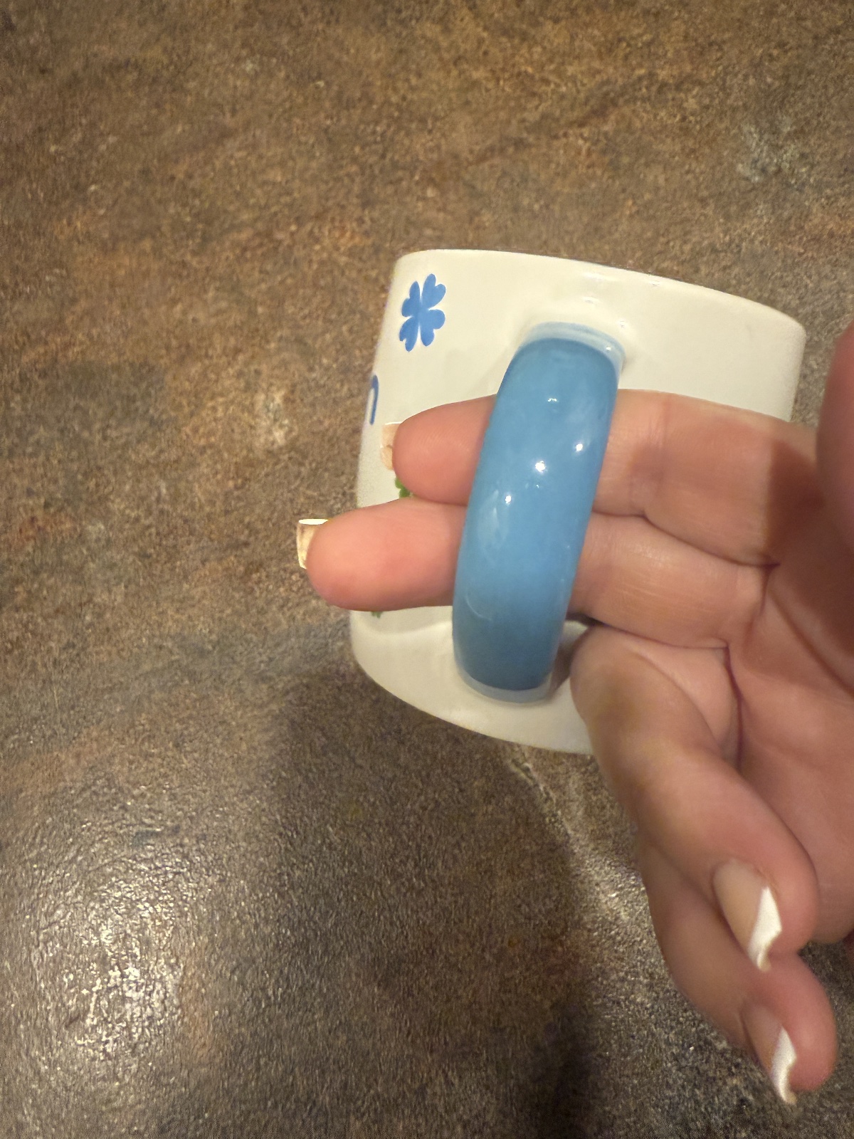💠 Farba: biela s modrým vnútrom a uškom, ozdobený zelenými a modrými štvorlístkami