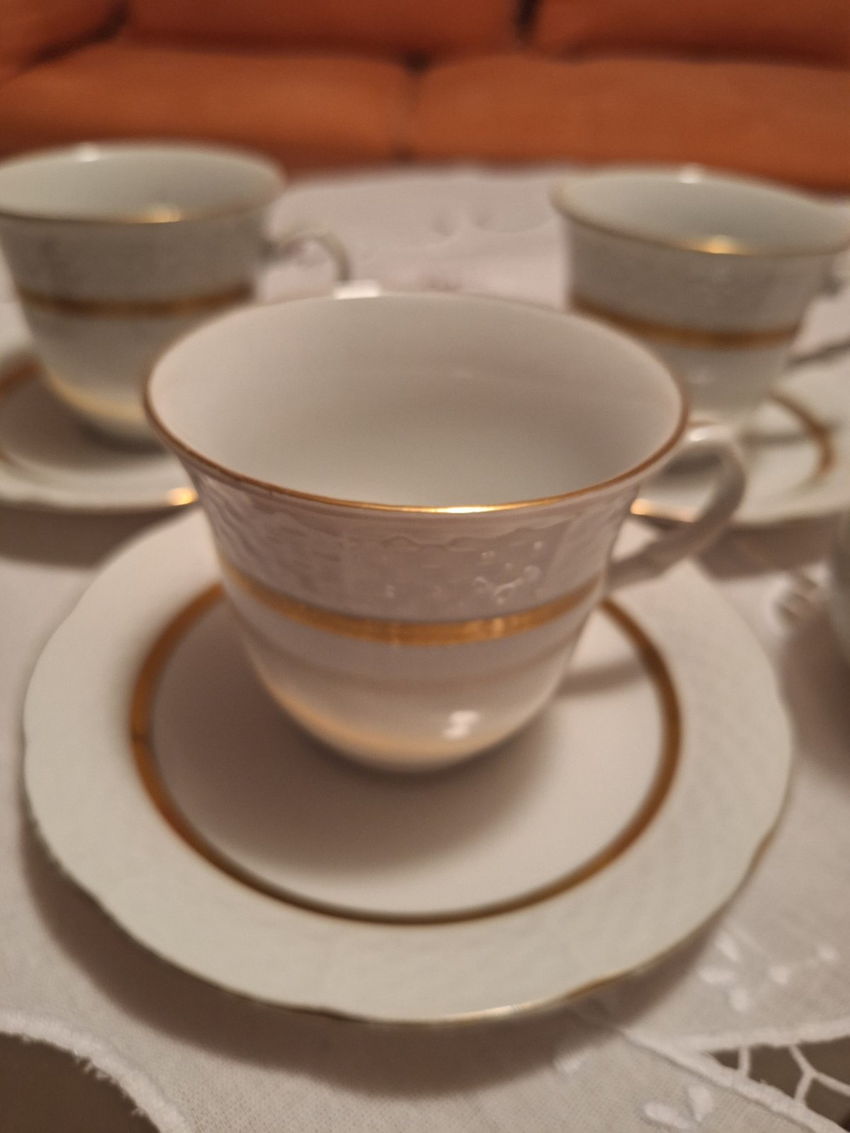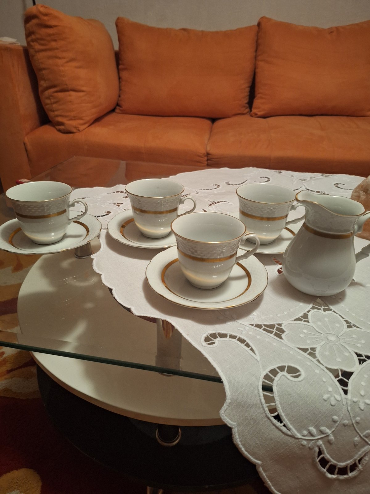4 šálky s podsalkou, nádoba na mlieko, značené, nepoškodené