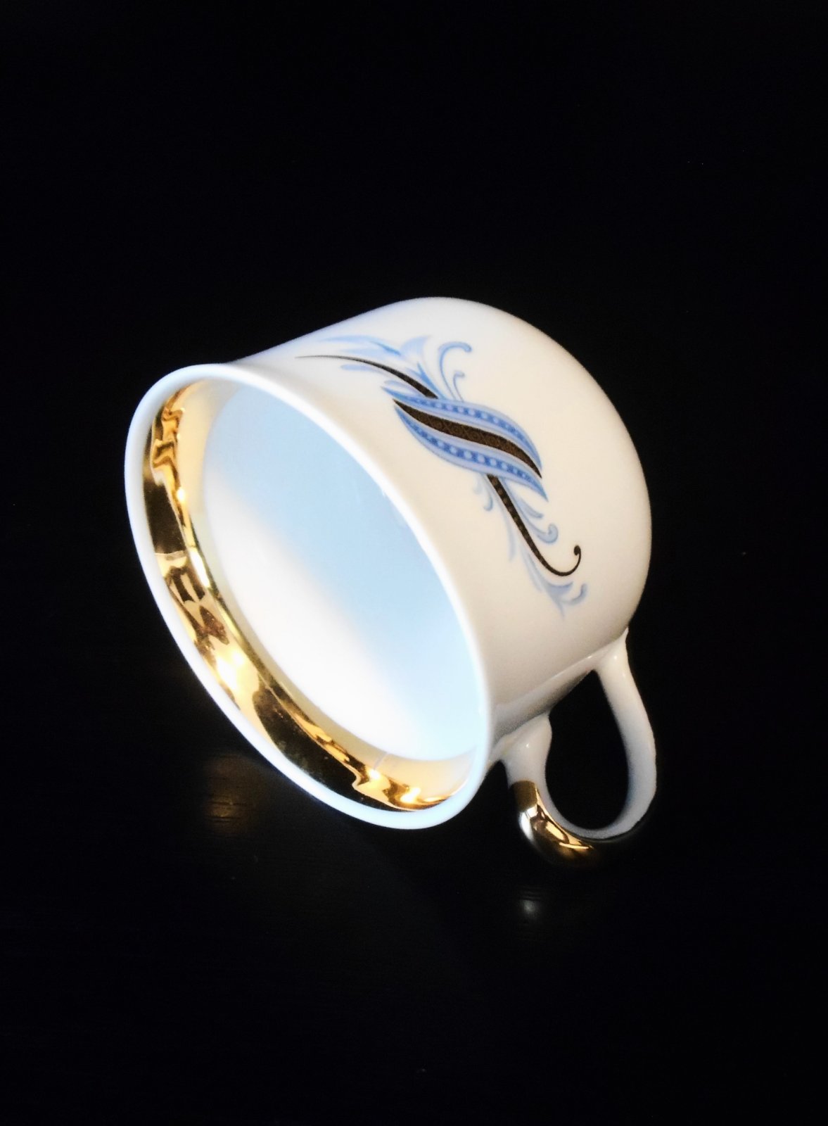 predám raz použitú súpravu dvoch šálok a podšálok na porcelánovej tácke, pozlátená, bohužiaľ sa nám podarilo poškodiť priesvitnú časť obalu, nevyužívame, len nám zaberá miesto