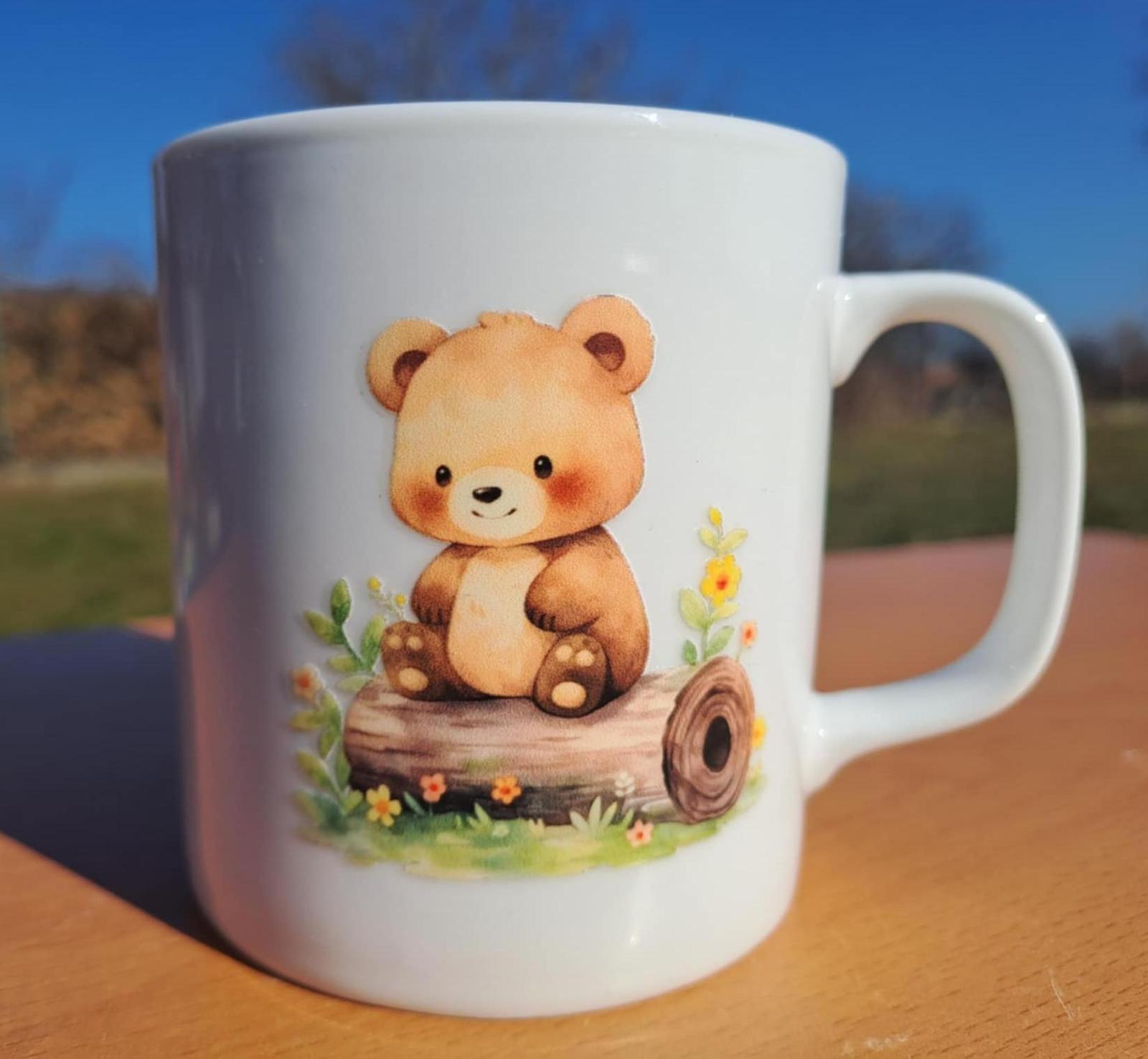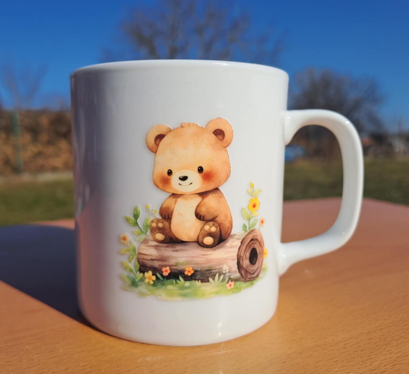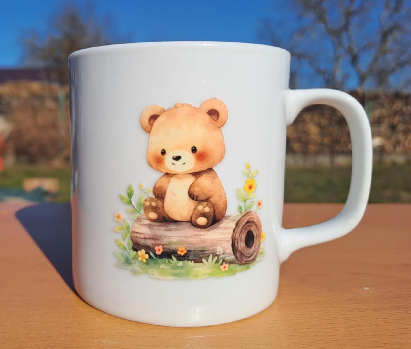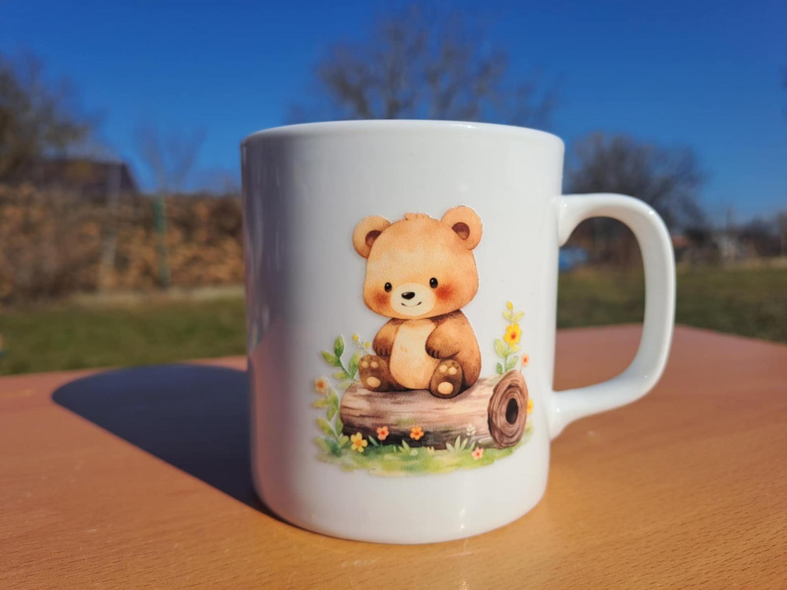 Originálny biely porcelánový hrnček s motívom roztomilého medvedíka sediaceho na kmeni.