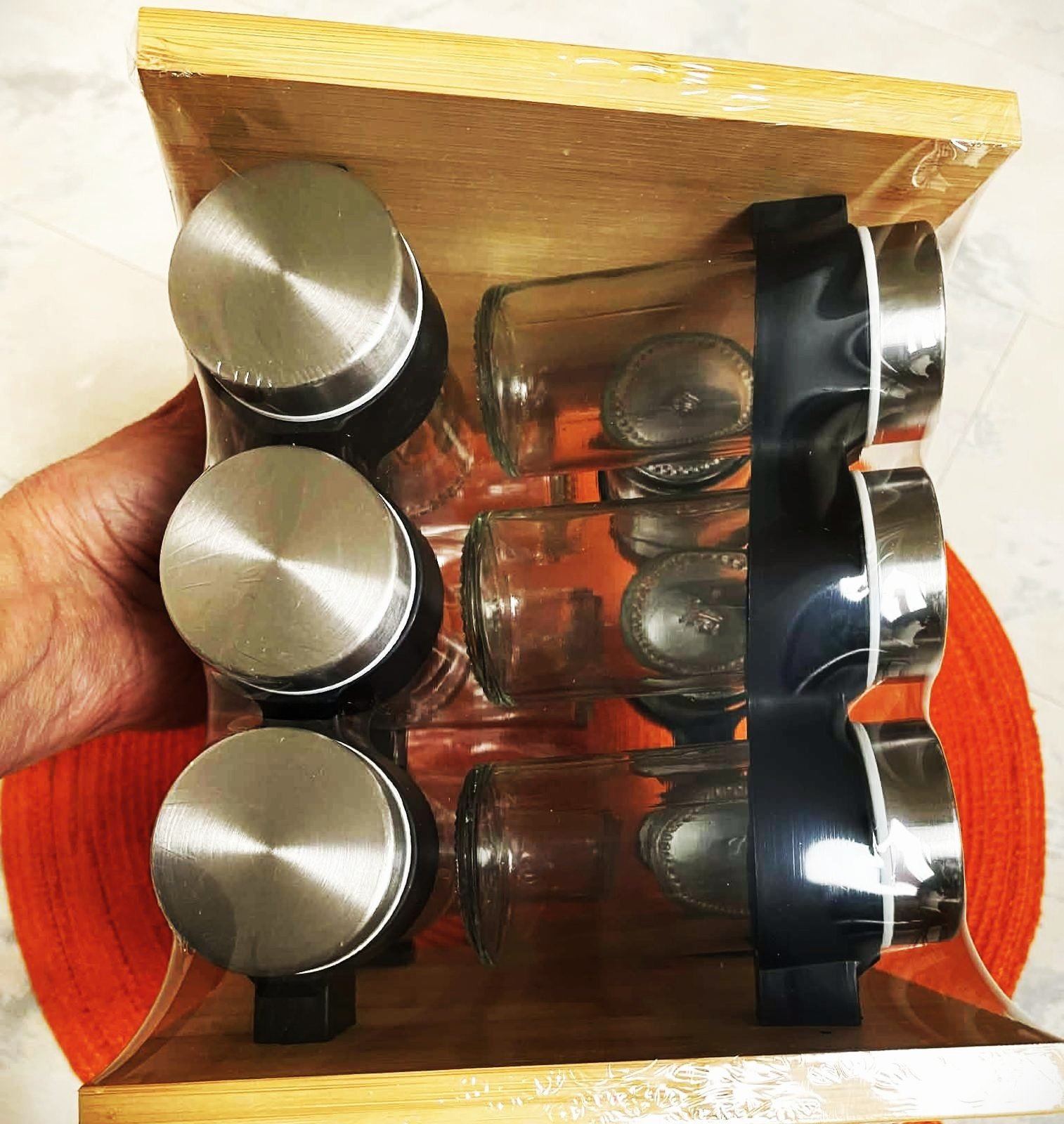 v prírodnej farba dreva,koreničky sú sklenené,nerezové viečka,objem 90 ml