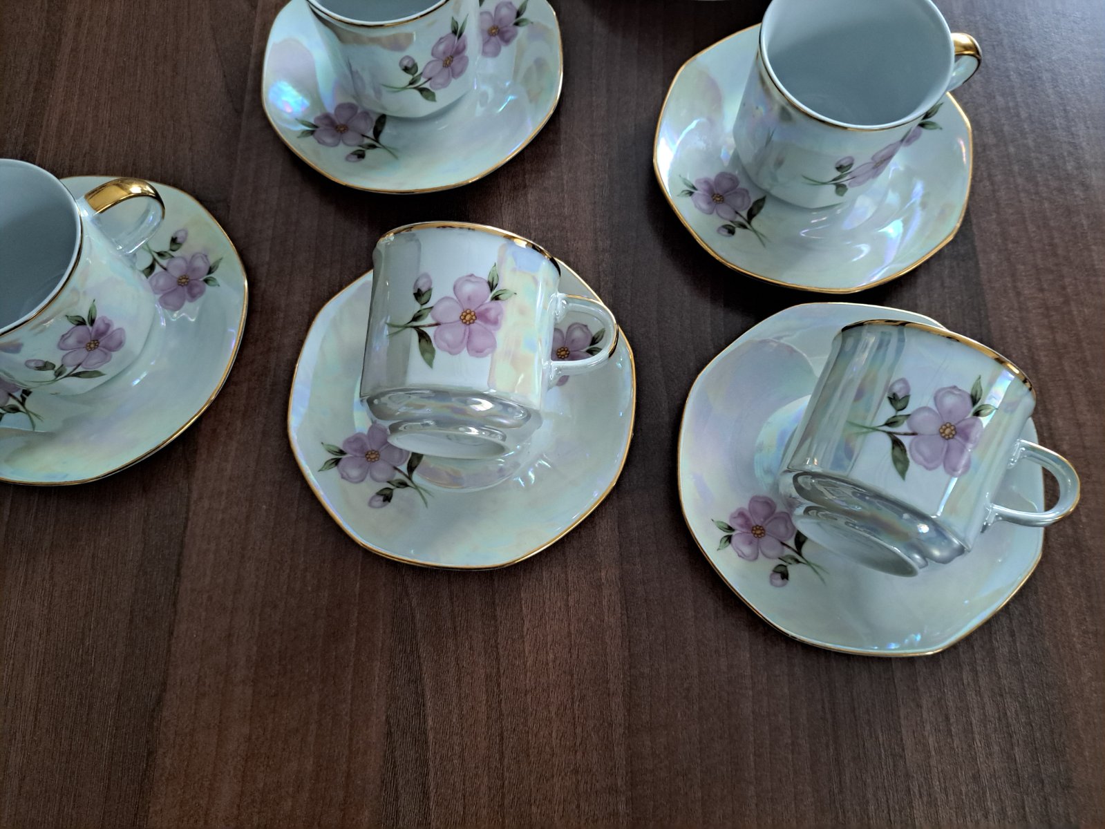 Bohatý set krásnej perleťovaj farby lemovaný zlatým pásikom. 6 šálok, 6 tanierikov, cukornička, mliečník,