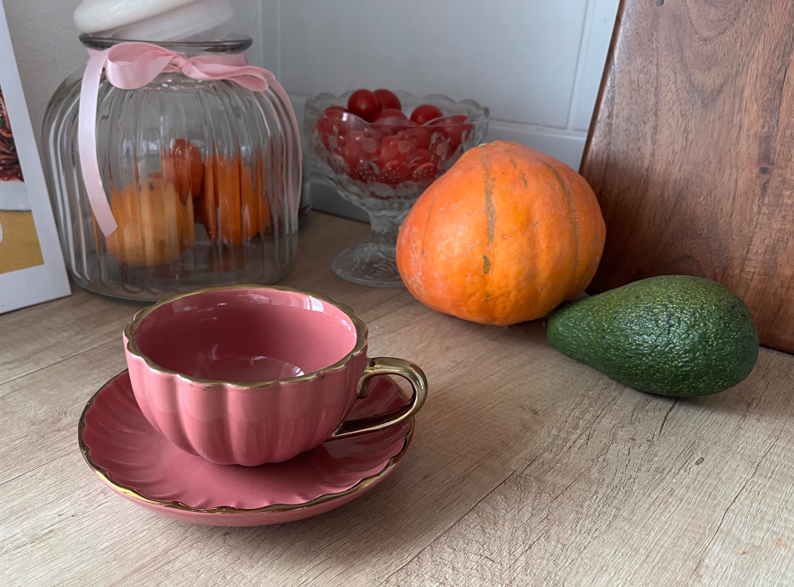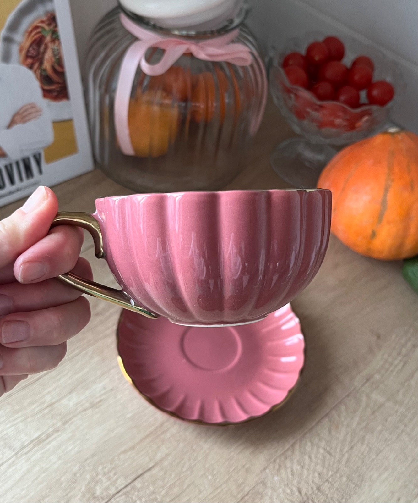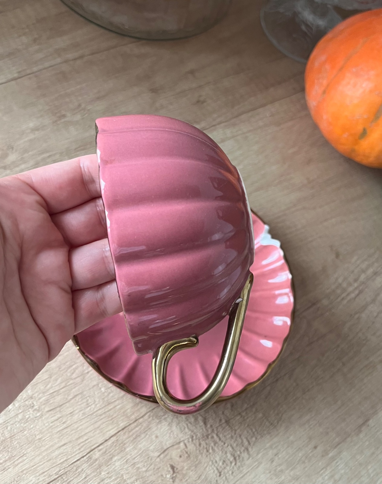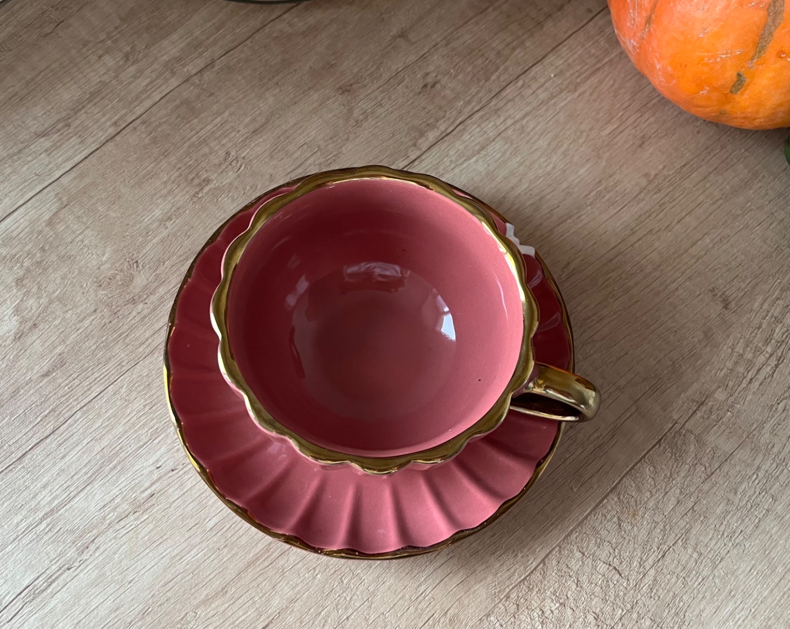 Ružovofialová keramická šálka s podšálkou