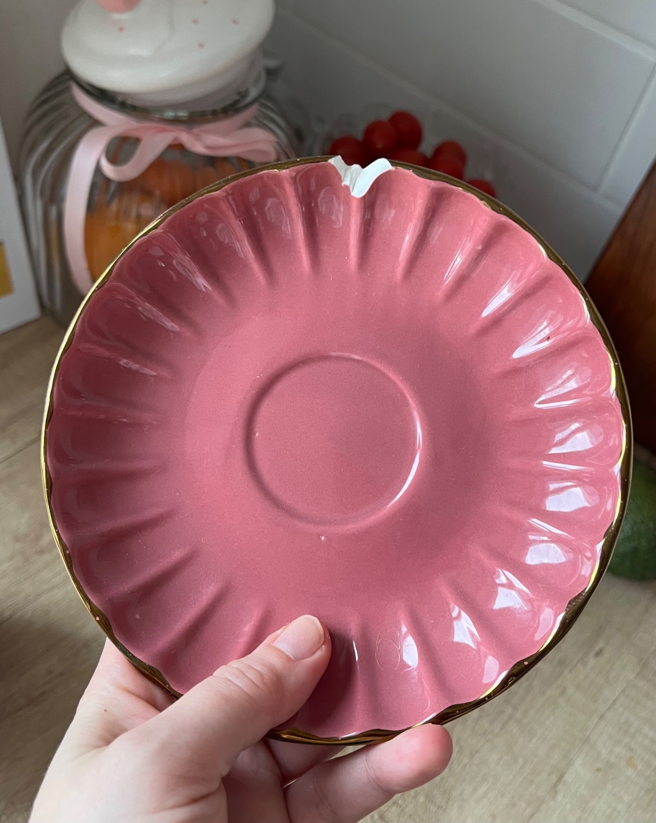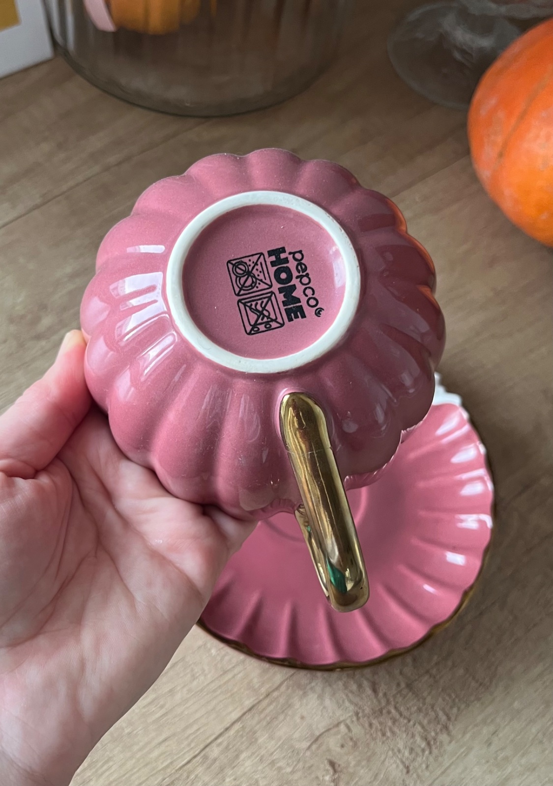 - párkrát použitá ružovofialová keramická šálka/hrnček s podšálkou