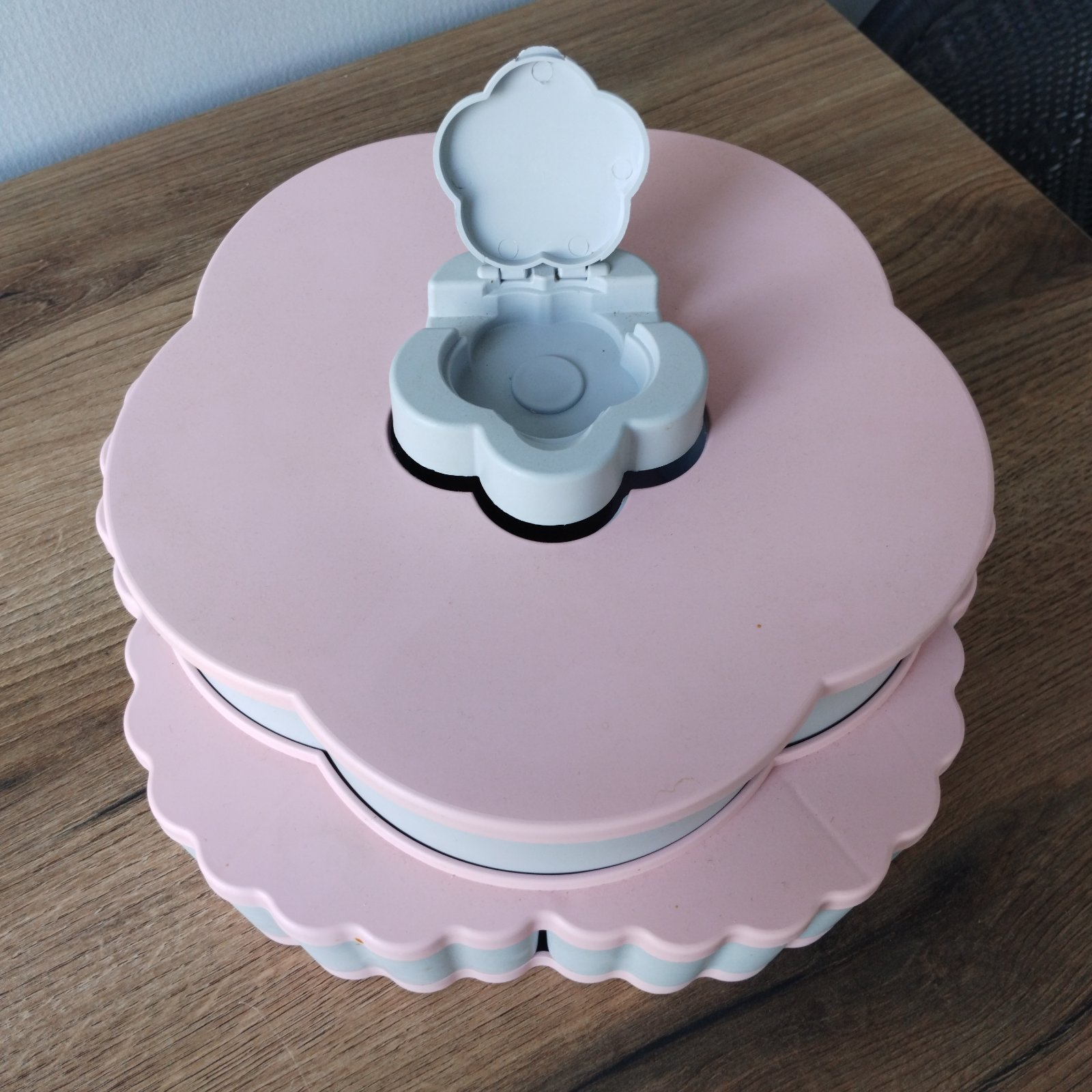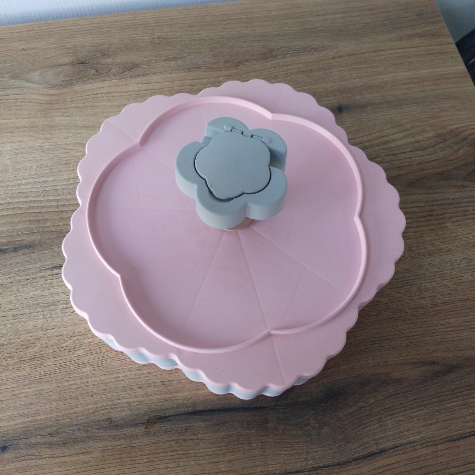 Plastový 3-poschodový etažér na zákusky či iné pohostenie, s ozdobným vlnkovitým efektom na koncoch tanierov, čisto nové, nerozbalené, v ružovej a v bielej farbe. Rozmery na foto. Cena za 1 ks 3 eu...