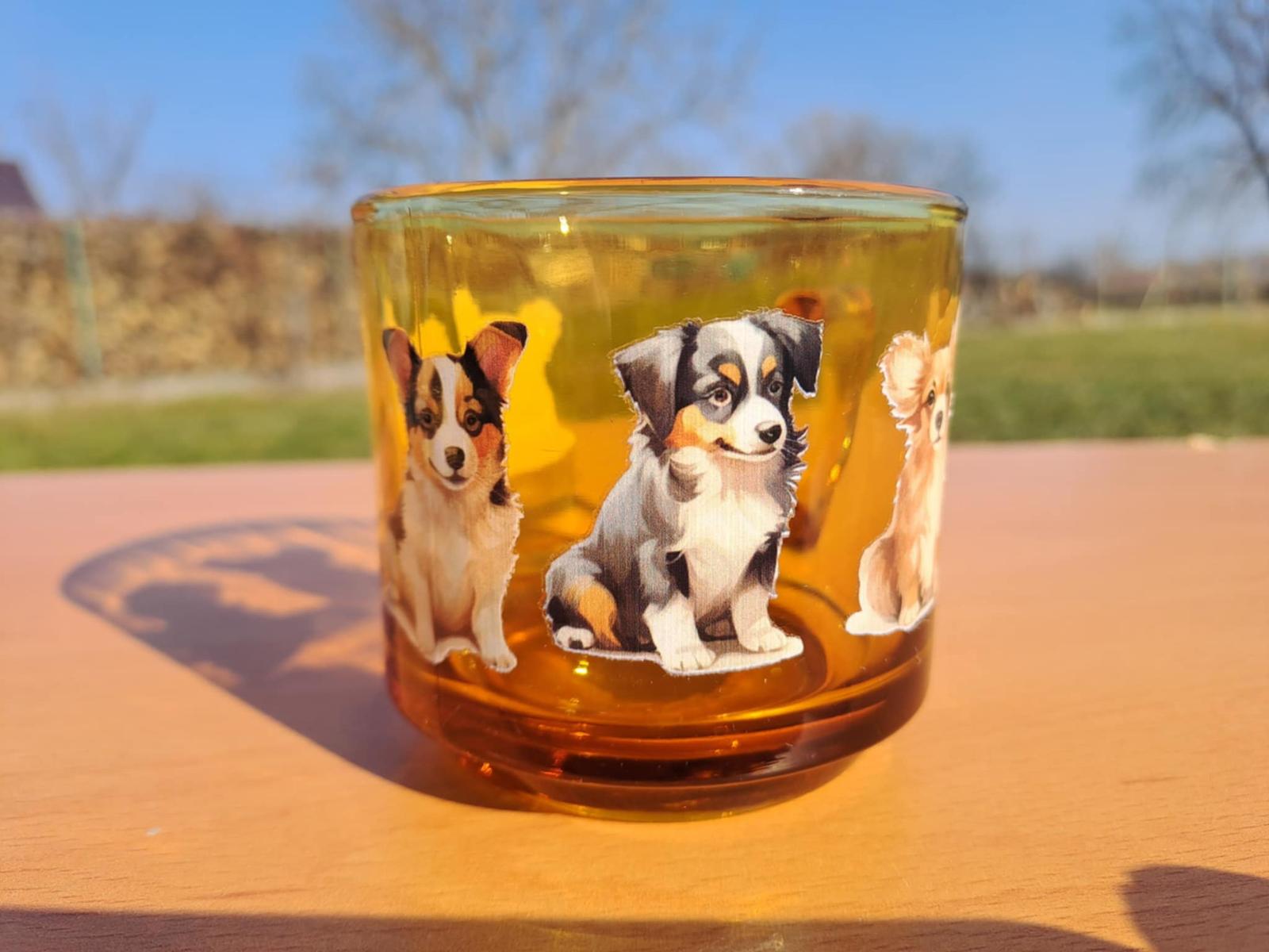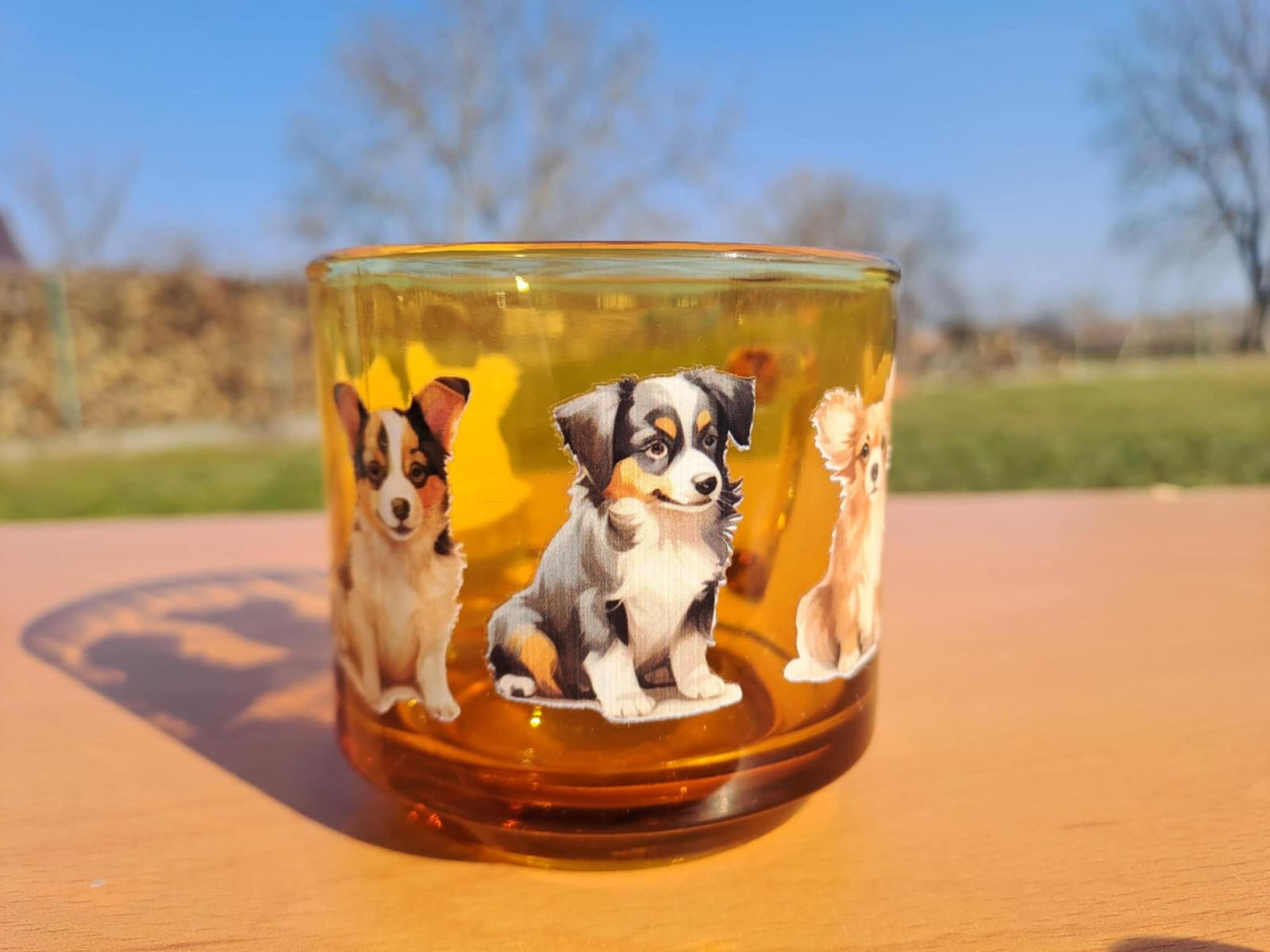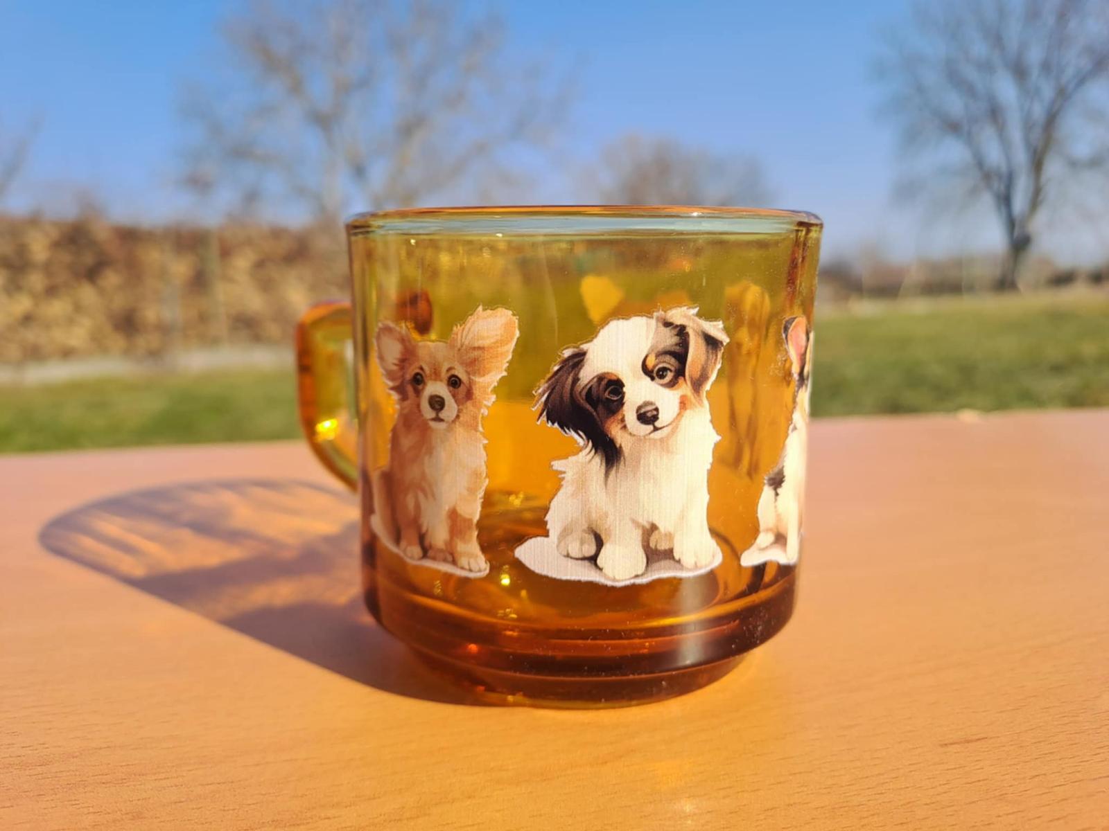 Originálny sklenený hrnček z hnedého skla s motívom 5 roztomilých psíkov.