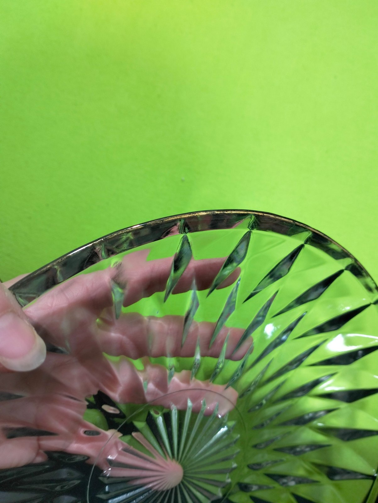 Skleneny tanier zo zlatym obramkom ale umyla som ho a zlaty obramok na urcitych miestach zliezol ale bol na sirku milimetrovy takze to ani nevidno priemer ma 24 cm