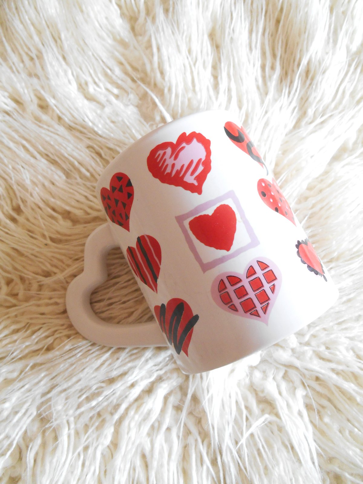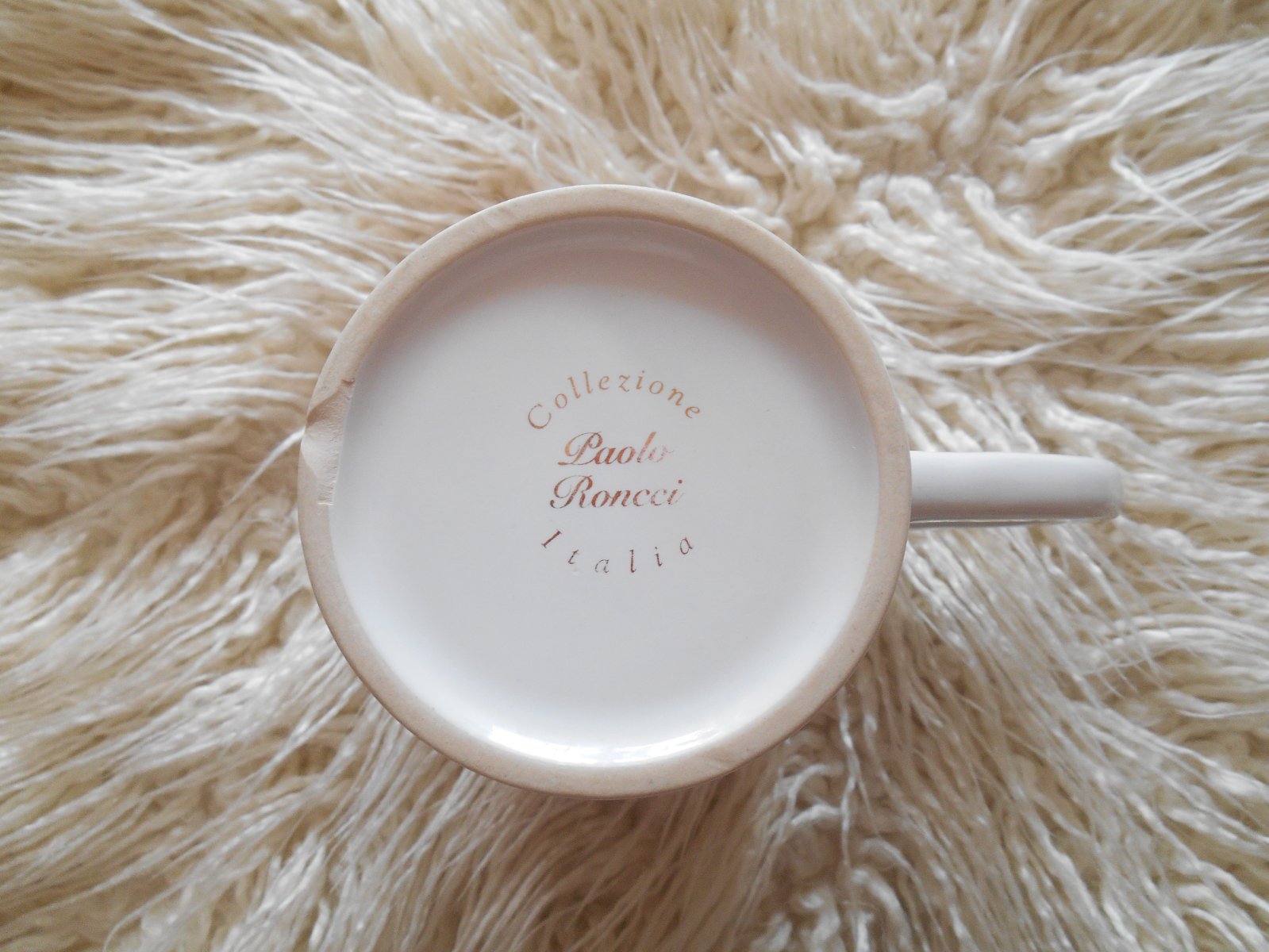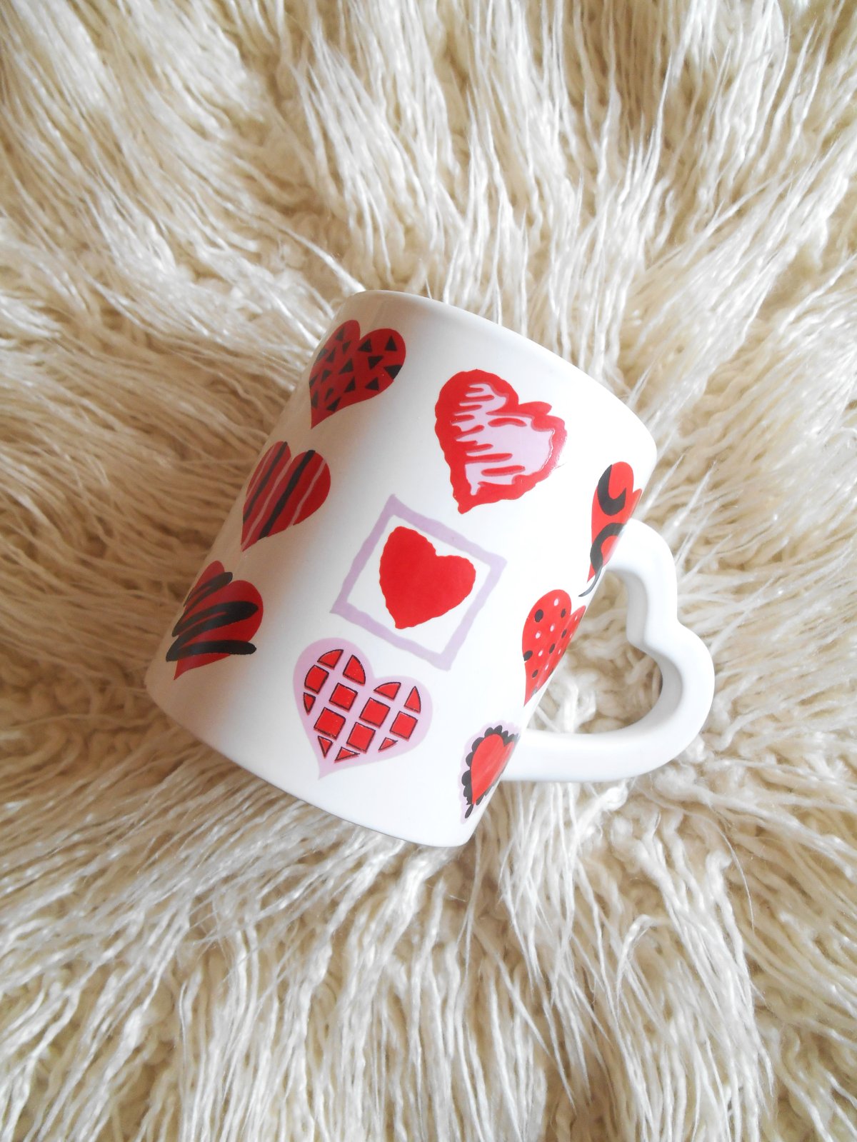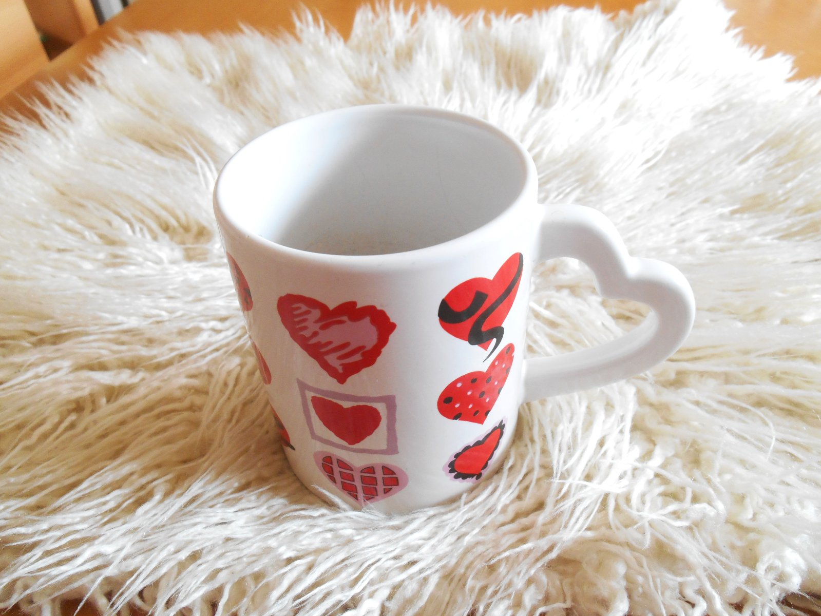 objem 300 ml, výška 9.5 cm, priemer 7.5 cm, hmotnosť 366 g, uško v tvare srdiečka, vo vnútri znaky po lyžičke, na dne šálky odlupnutie - nafotené