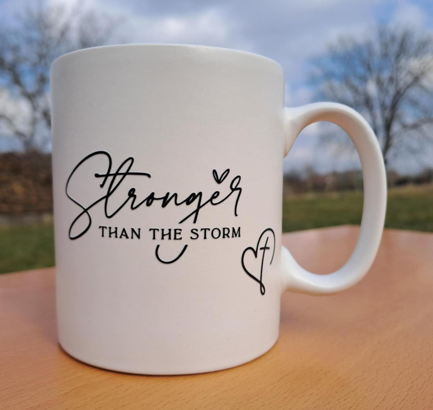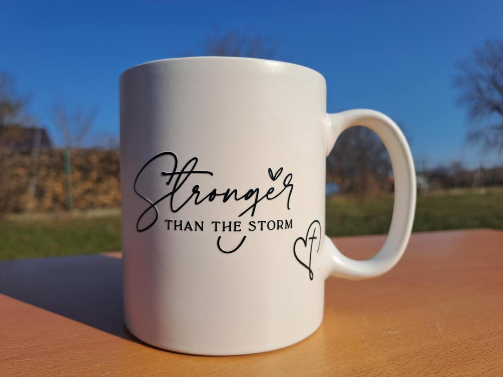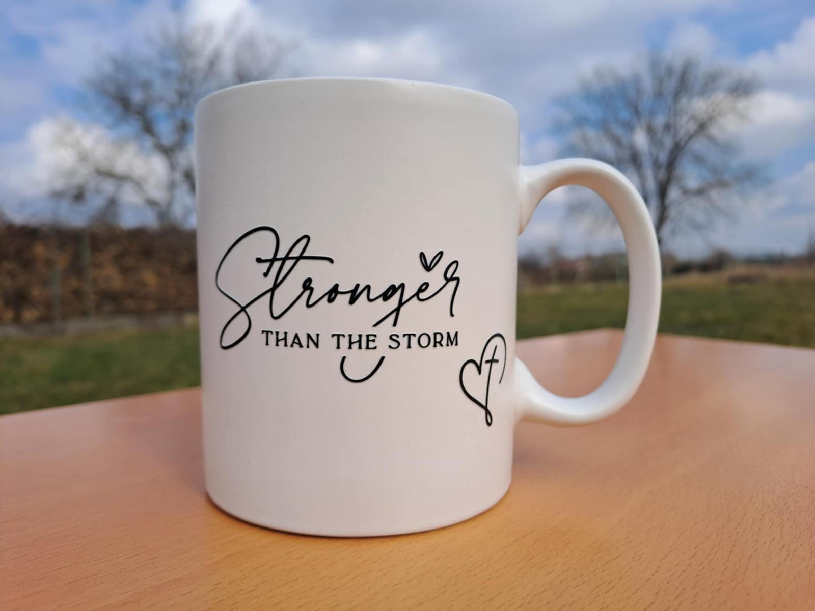 Keramický hrnček biely Stronger than the storm (Silnejší ako búrka).