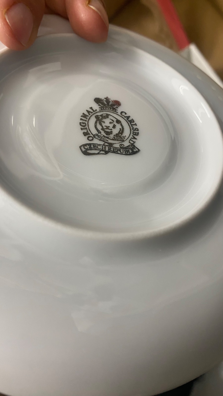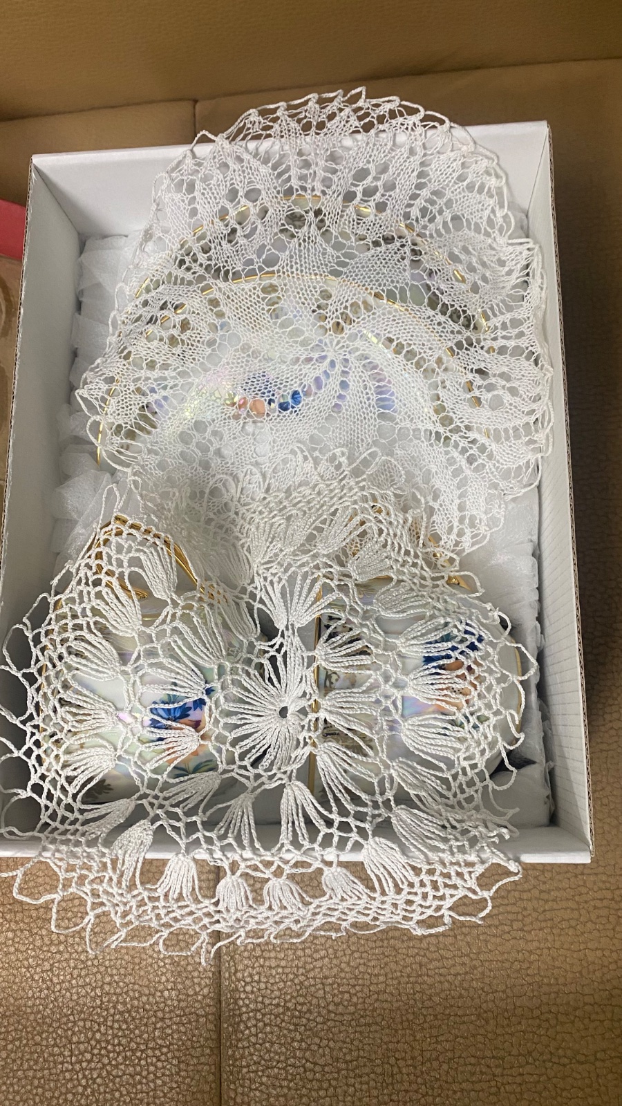 Perletova farba. Nepouzivane krasne salky a podsalky s 2 vysivanymi deckami.
