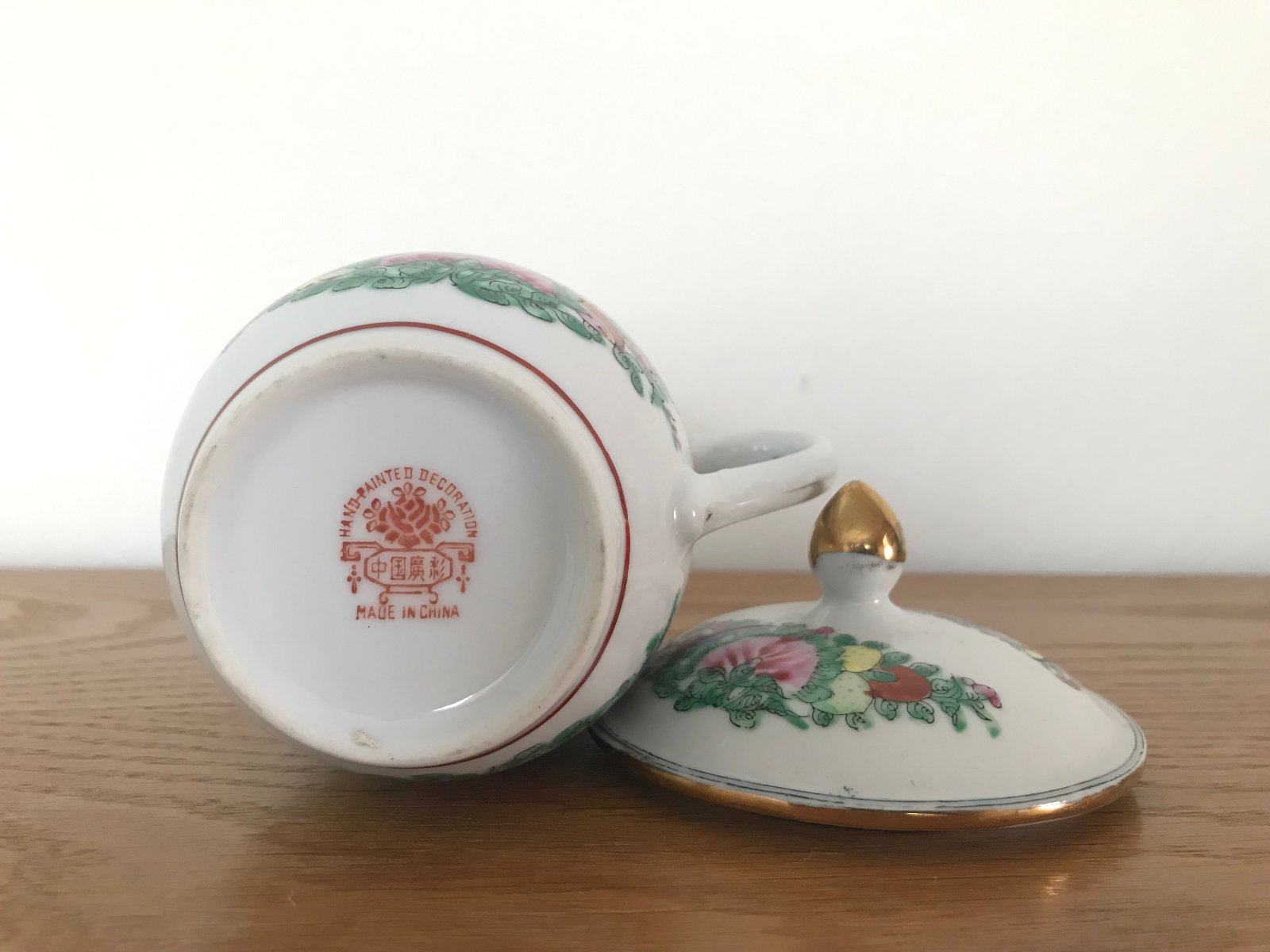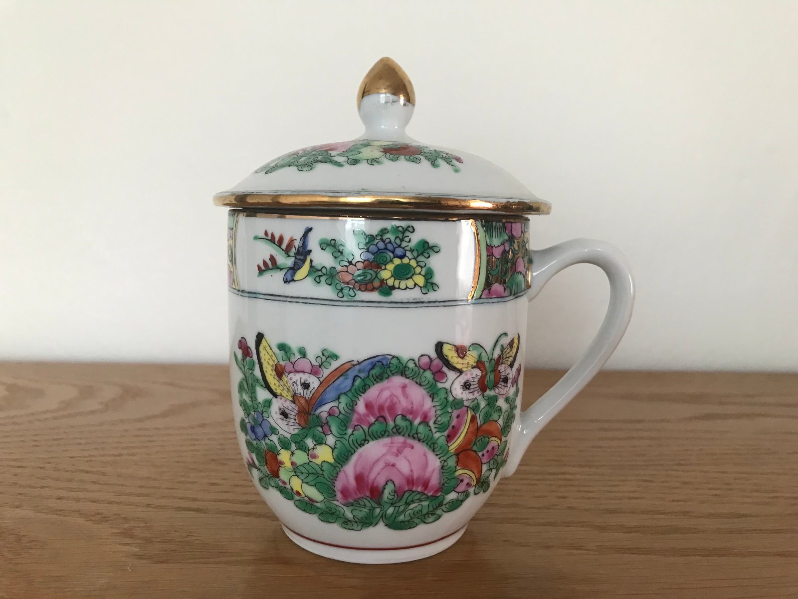 Vintage čínsky hrnček s pokrievkou, ručne dekorovaný. Výška 13,5 cm. Nepoužívaný, vitrínový stav.