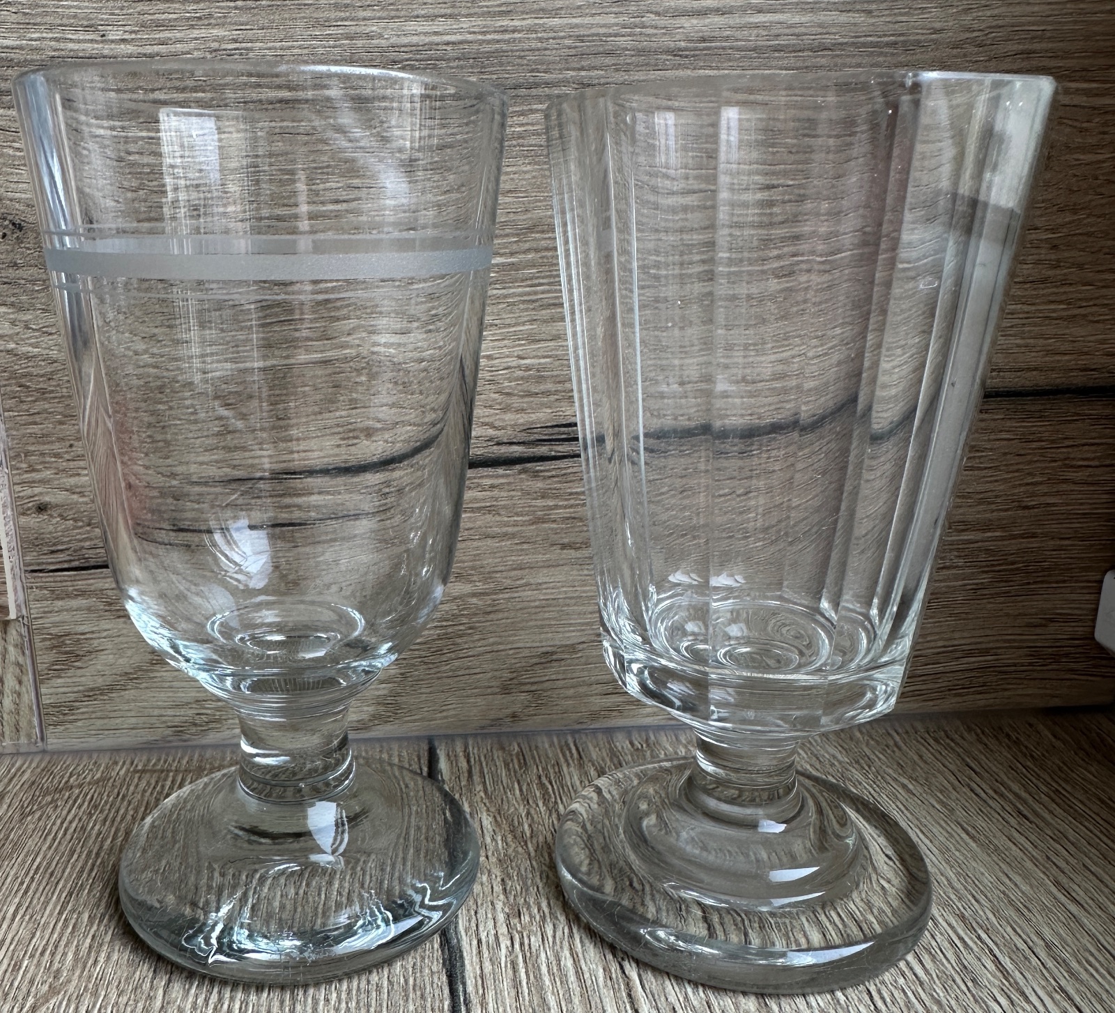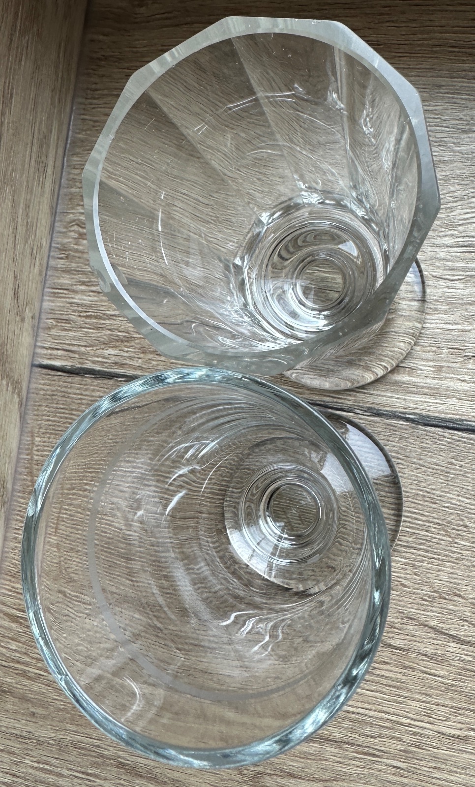 ❤️☘️Predám 2 RETRO sklenené poháre na stopke. Každý iný vzor – jeden hladký s matnými linkami, druhý s fazetovým (hranatým) dekorom. Vhodné na zmrzlinu, dezerty, miešané nápoje alebo ako dekoračné poháre.Materiál: číre sklo, masívna okrúhla podstava.KUS/50centov.❤️☘️