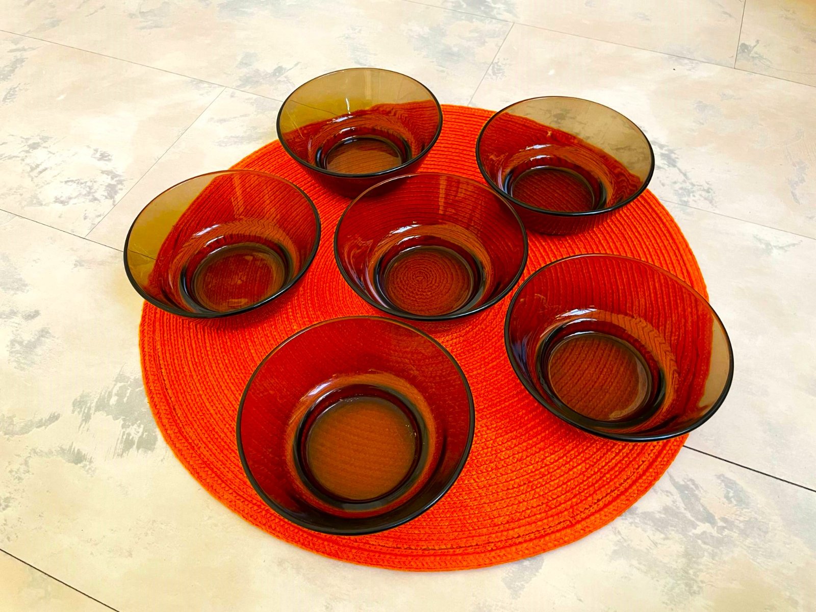 sada mištičiek z pyrexového hrubého skla,na kompót,šaláty,zmrzliny a pod.je to priesvitné dymové sklo,nerozbitné,vhodné do mikrovlnky i do umývačky riadu,priemer = 12 cm, výška 5 cm