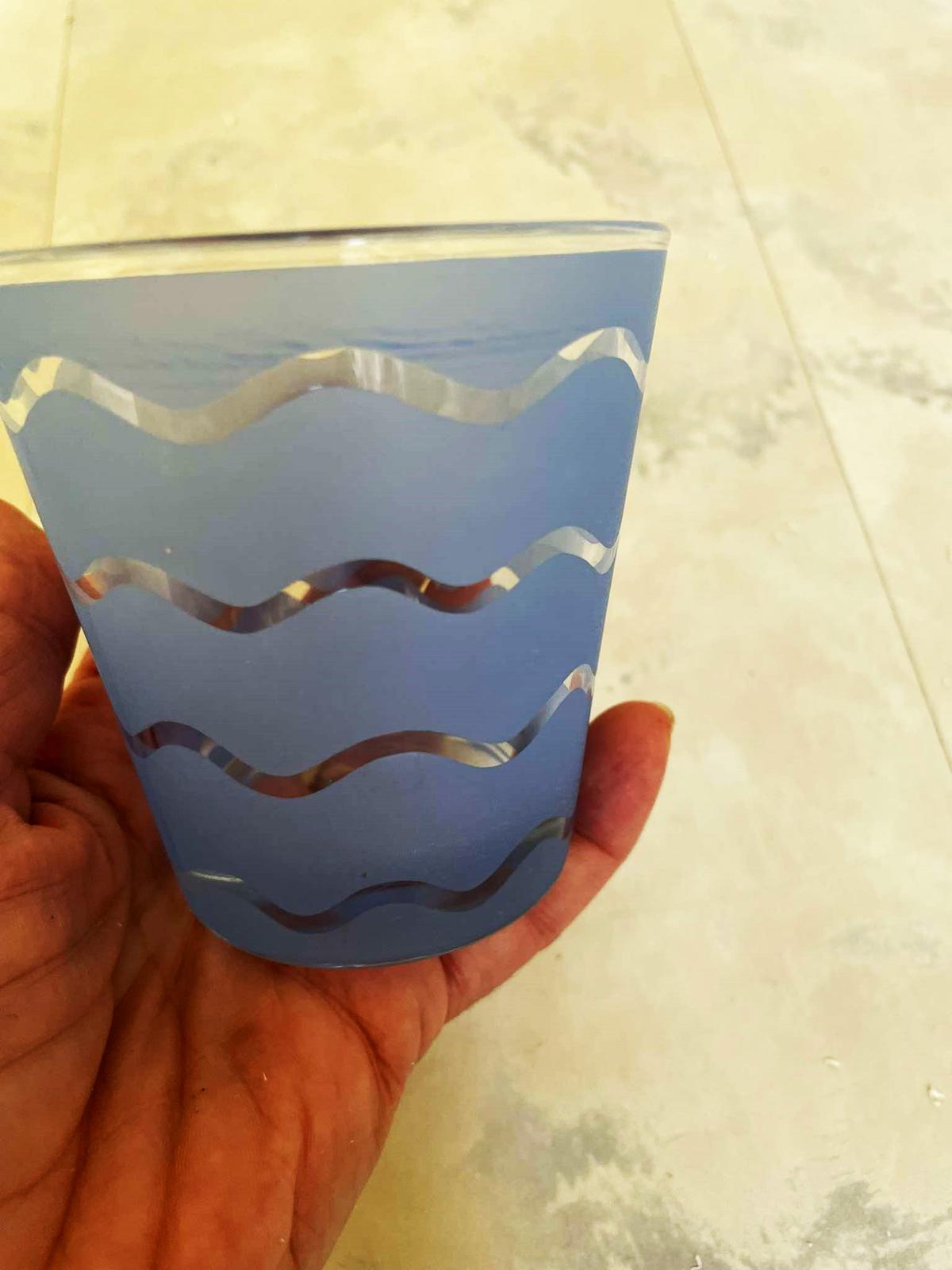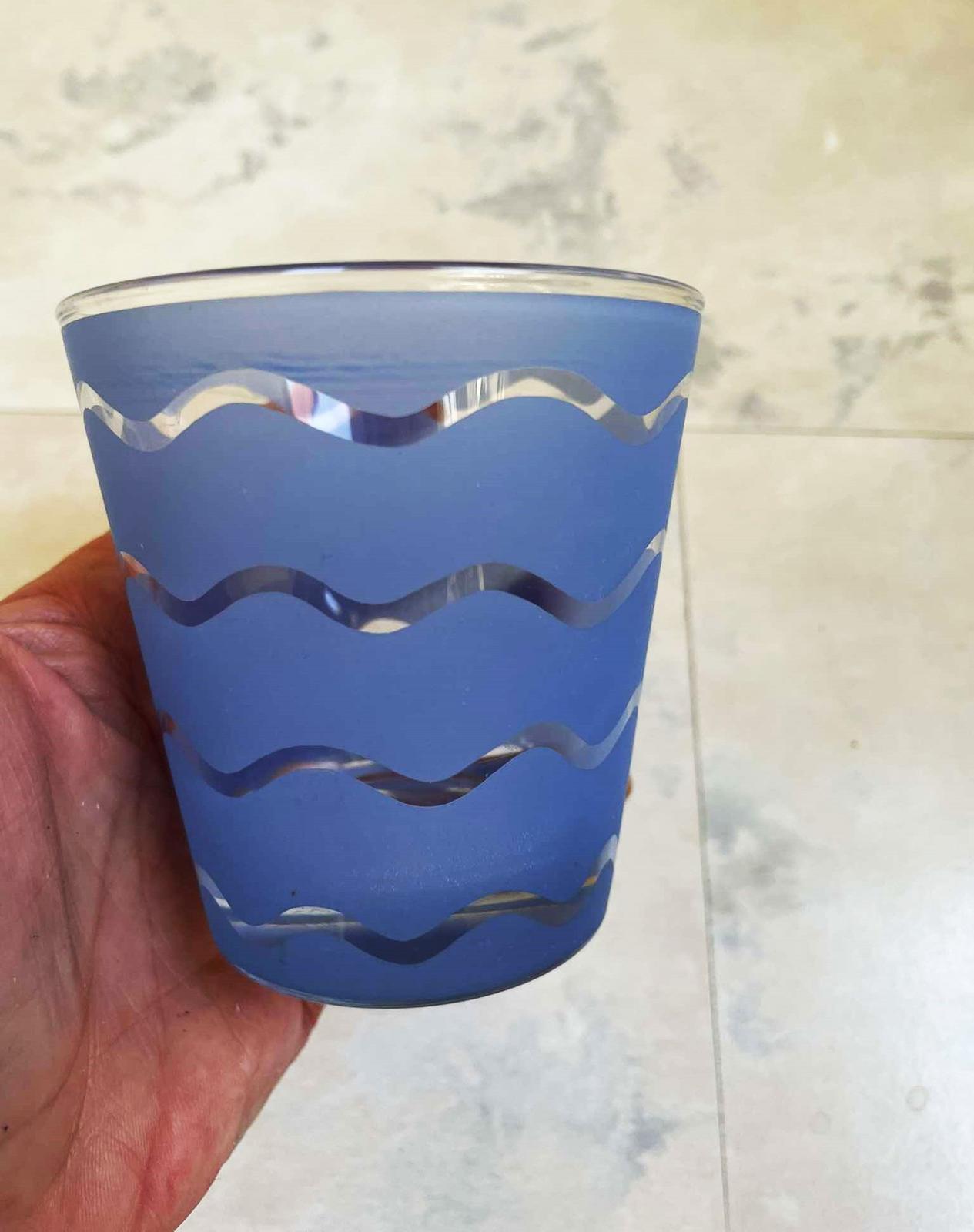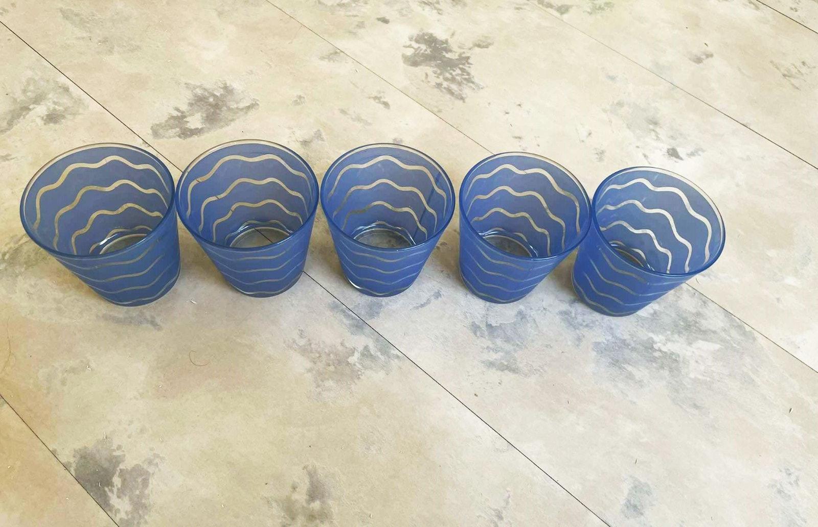krásna sada používaných nepoškodených pohárov - 5 ks,ako keby maľované na skle,hrubé nerozbitné sklo,veľmi zaujímavý tvar,výška = 9 cm,vrchný priemer = 8,5 cm, spodný priemer = 6 cm