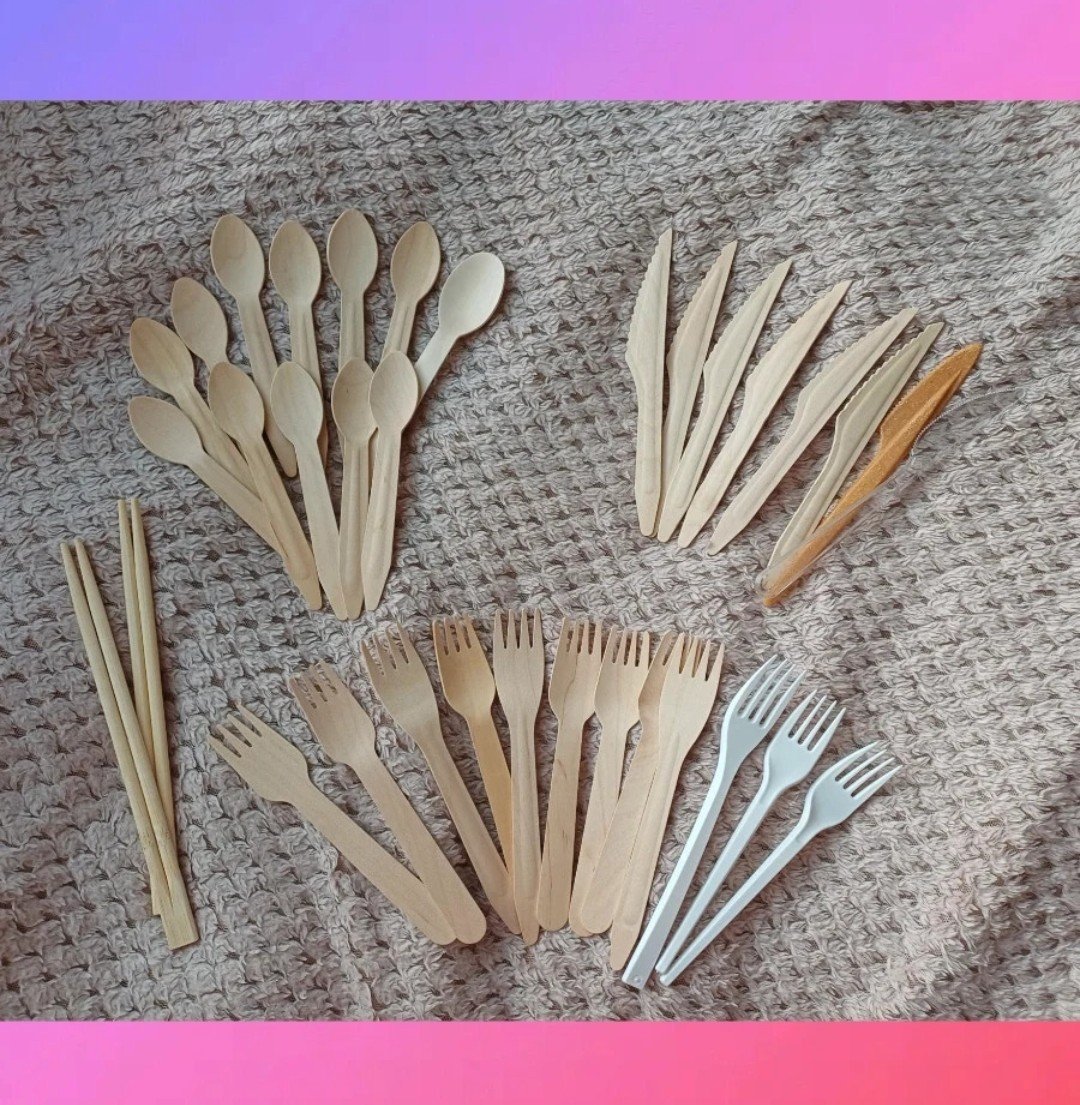 Jednorázový príbor,až na pár plastových vidliečiek a noža je príbor z EKO materiálu.Nepoužívané,len skladované.