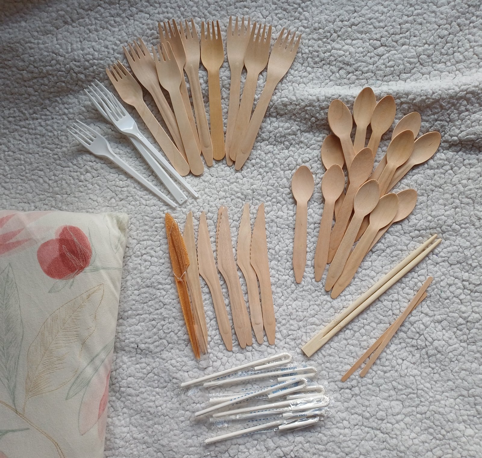 Jednorázový príbor,až na pár plastových vidliečiek,slamiek a noža je príbor z EKO materiálu.Nepoužívané,len skladované.