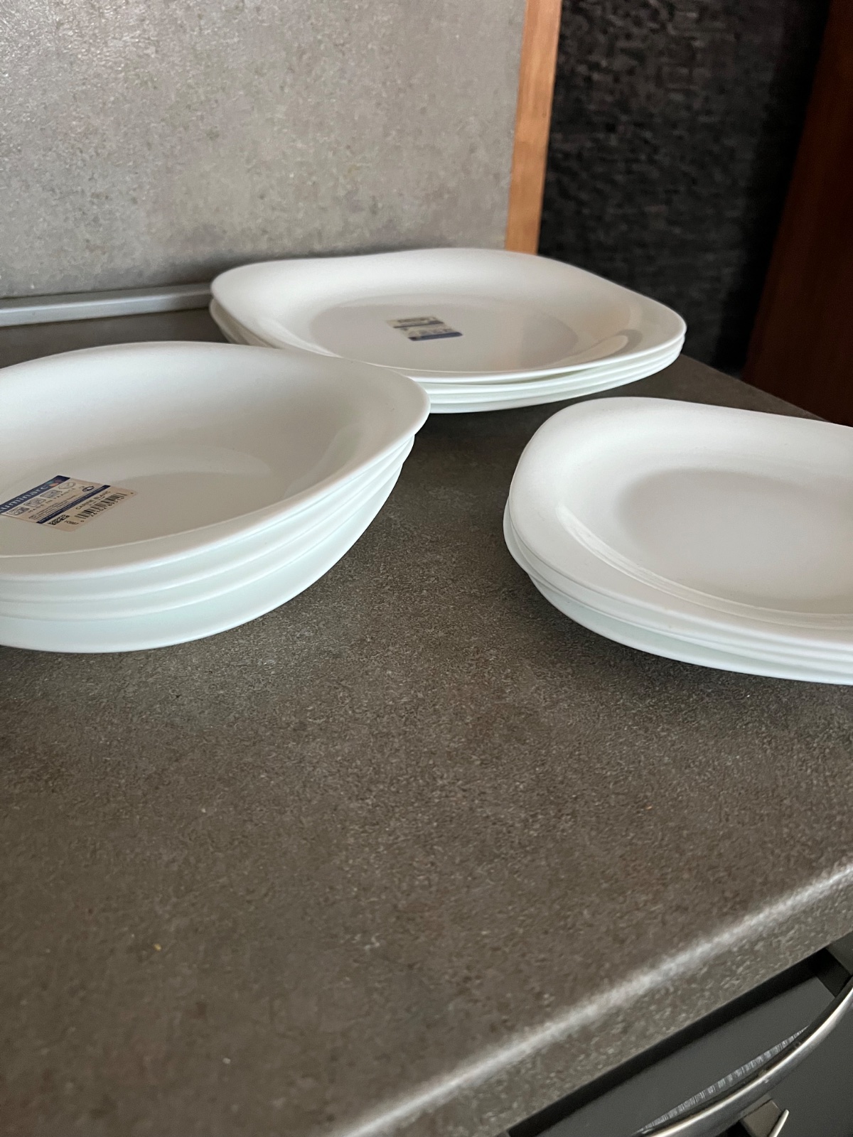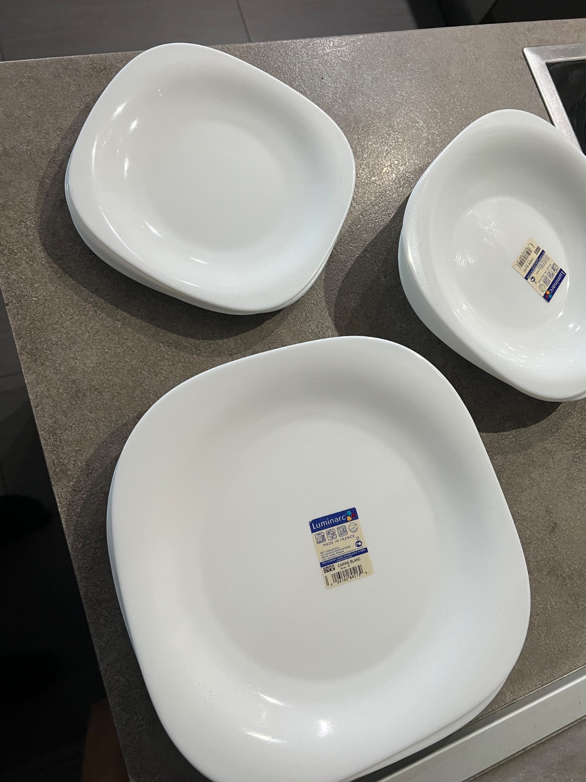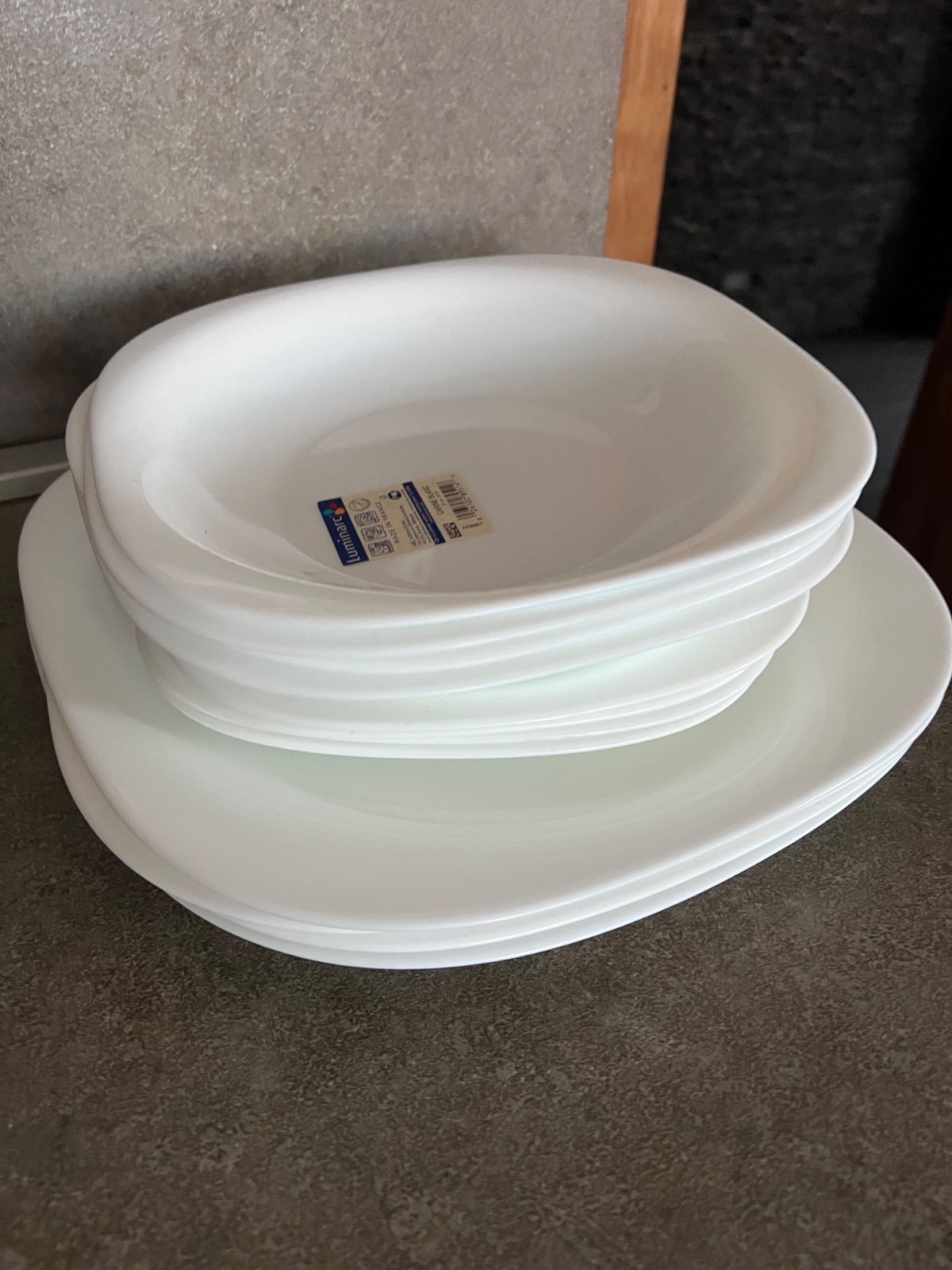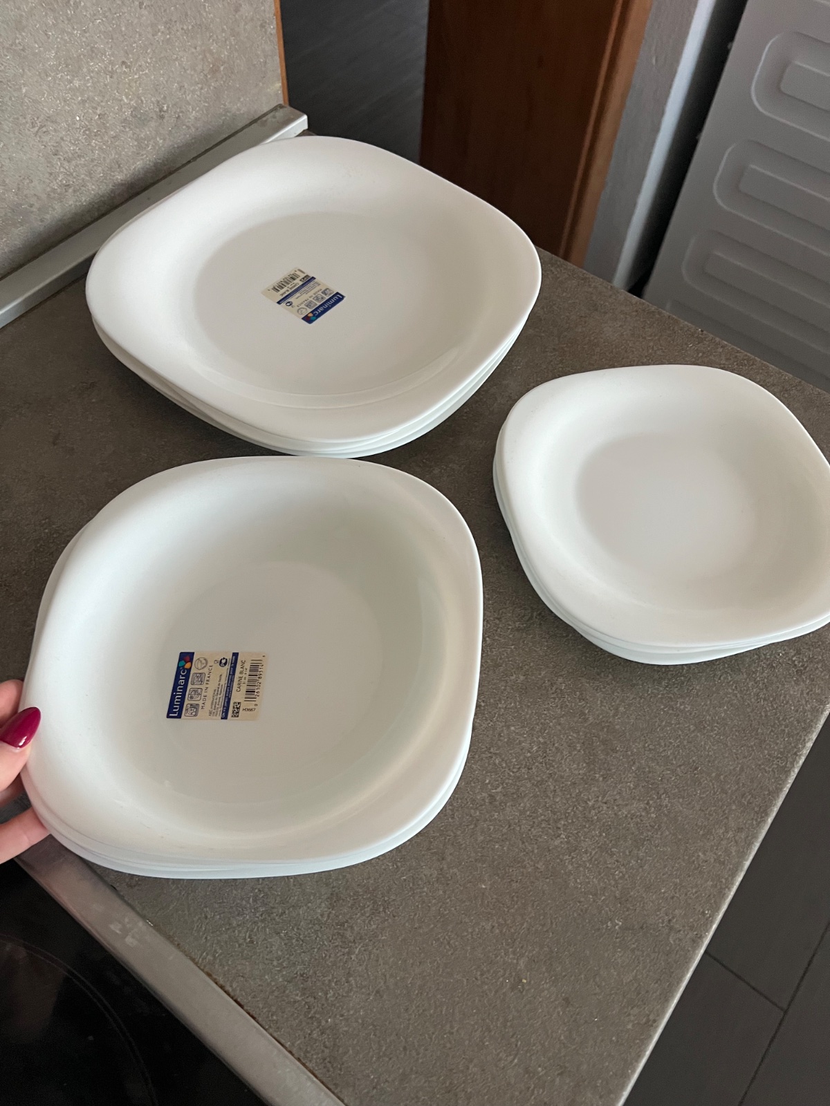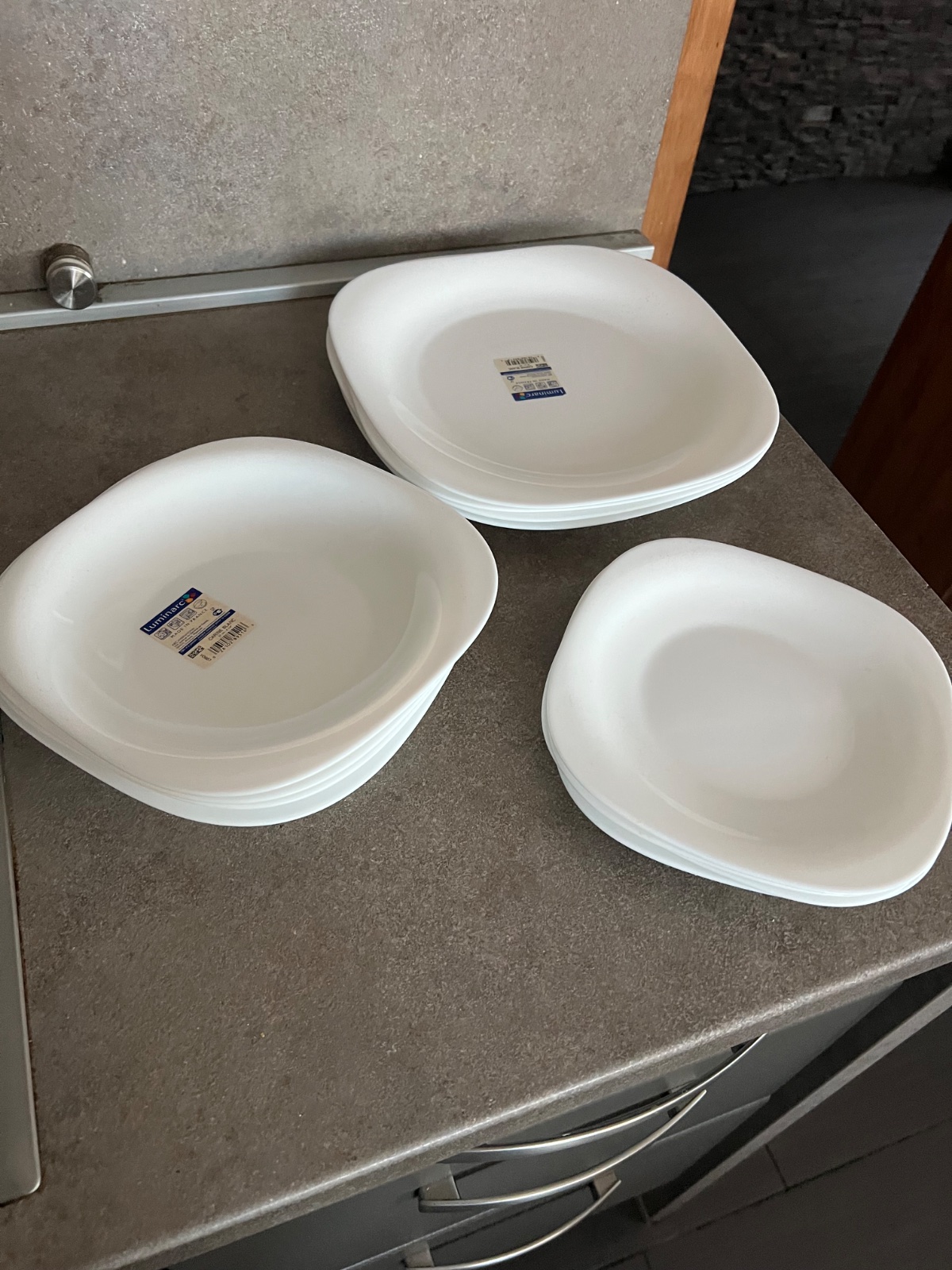 Neúplná sada tanierov ktorá obsahuje veľkú hlbokú misu 3x malý tanier 2x hlboký a 4x veľký tanier