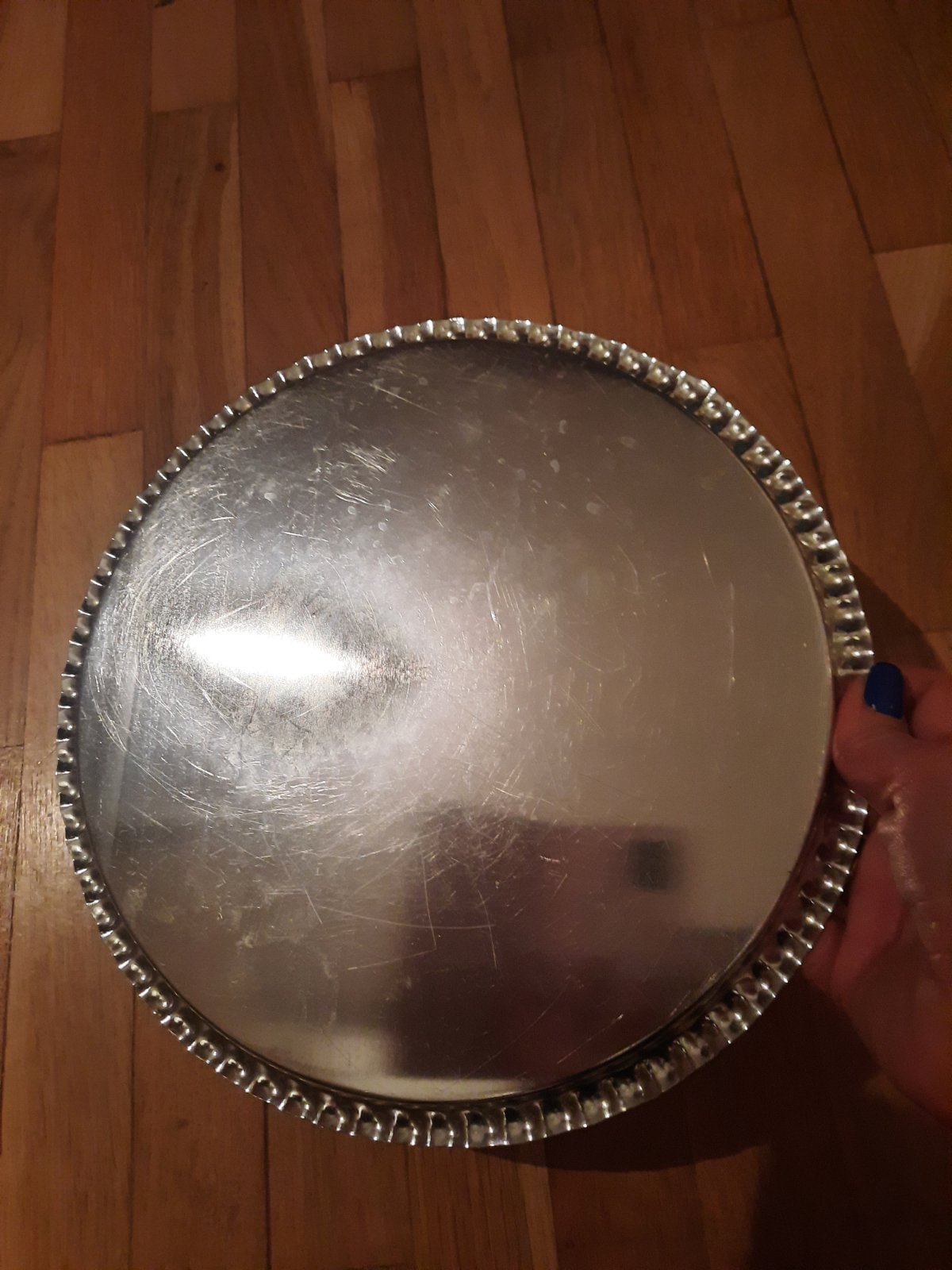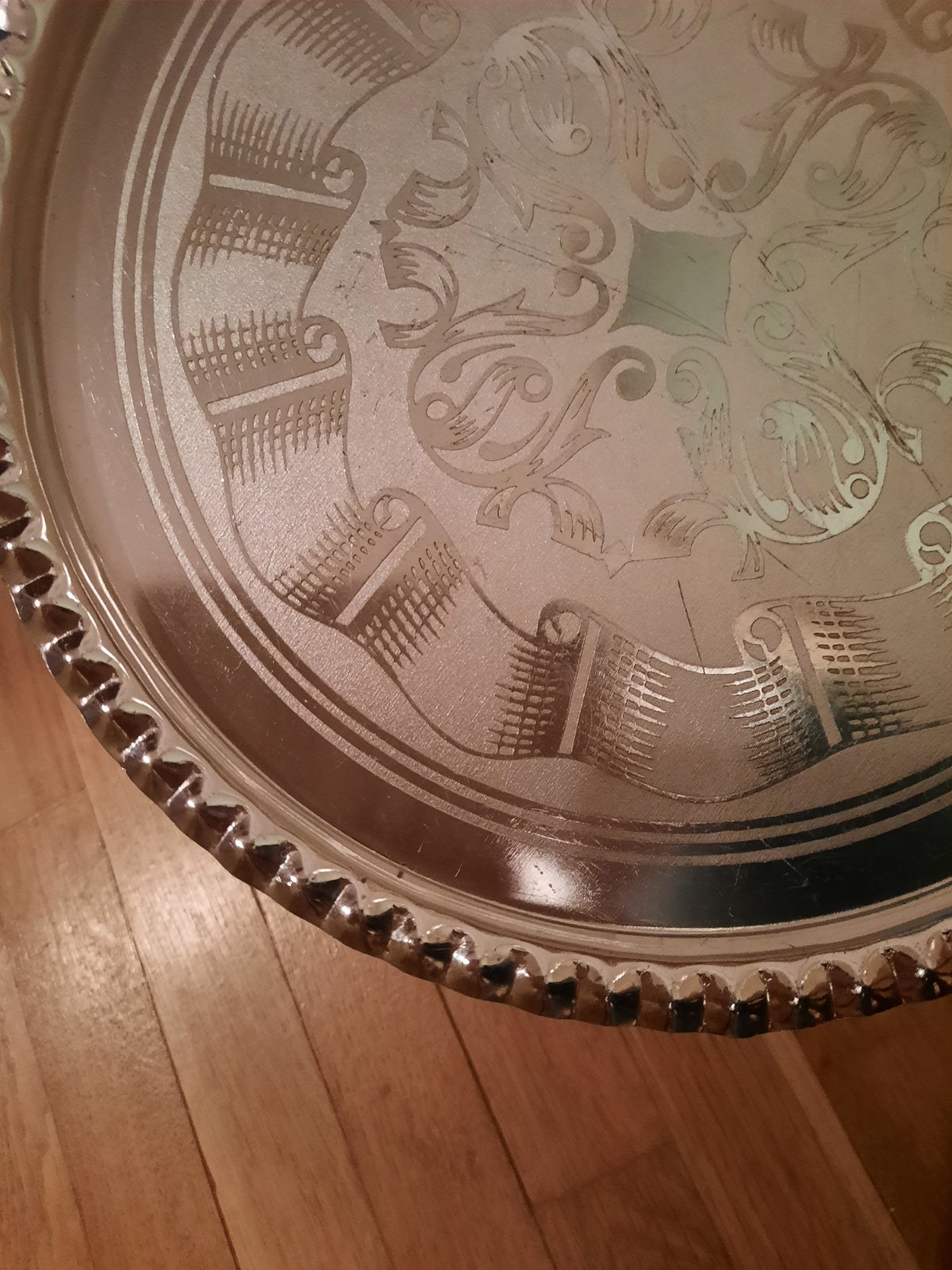 nádherný veľký podnos, min.užívaný,ako nový,top stav,priemer = 40 cm, výška = 6 cm,krásny vzor,čipkovaný okraj,materiál - kvalitný pozinkovaný plech,farba svetlošedá jemne hrajúca do nádychu zelenk...