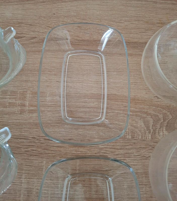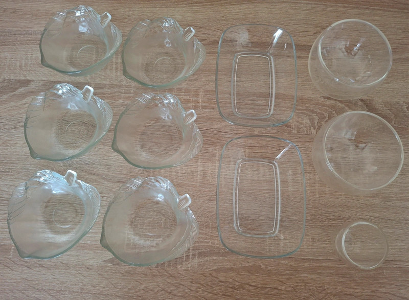 Misky nepoužívané, termomisky len odskúšané, sada 6ks kompótových misiek tvar list, priemer 12cm, výška 4cm, sada 2 sklenených obdĺžnikových misiek 12x17cm, výška 4cm, sada 2ks termomisiek z dvojitého skla, priemer 11cm, výška 7cm. Cena za všetko spolu za 12 eur, malý termopohárik 6x6 cm pridám zdarma.