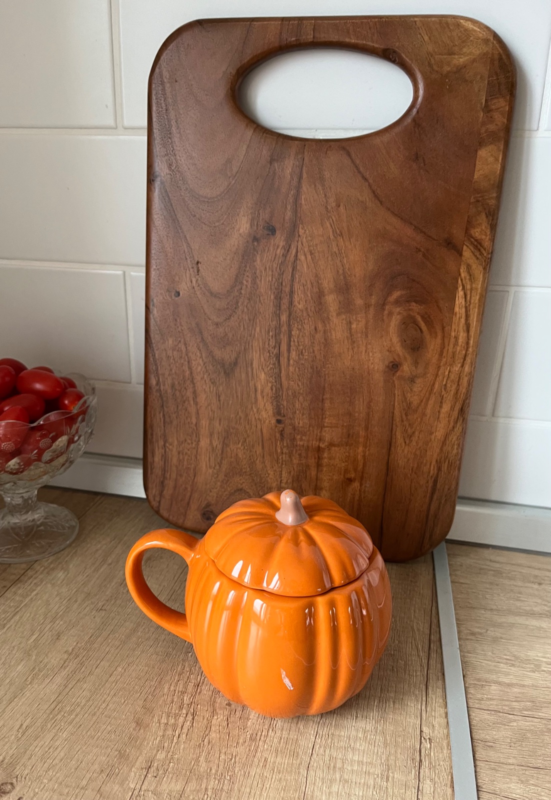 - párkrát použitý oranžový tekvicový hrnček/šálka s pokrievkou