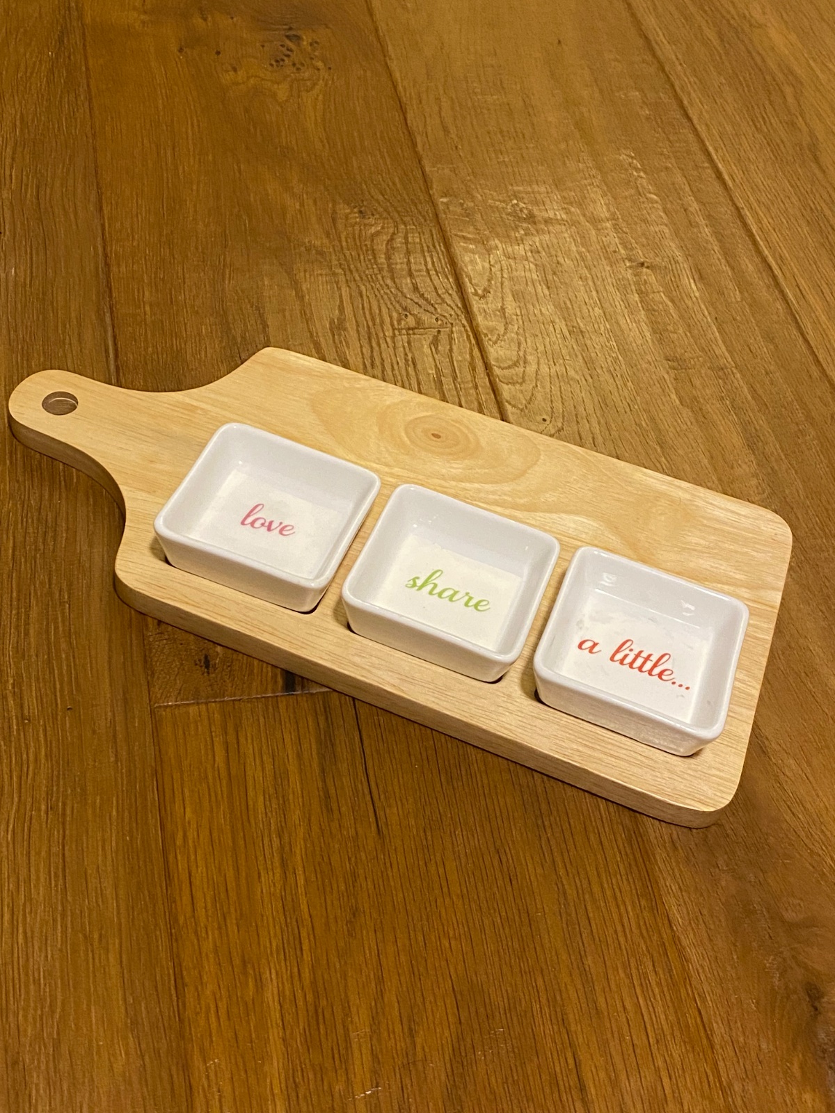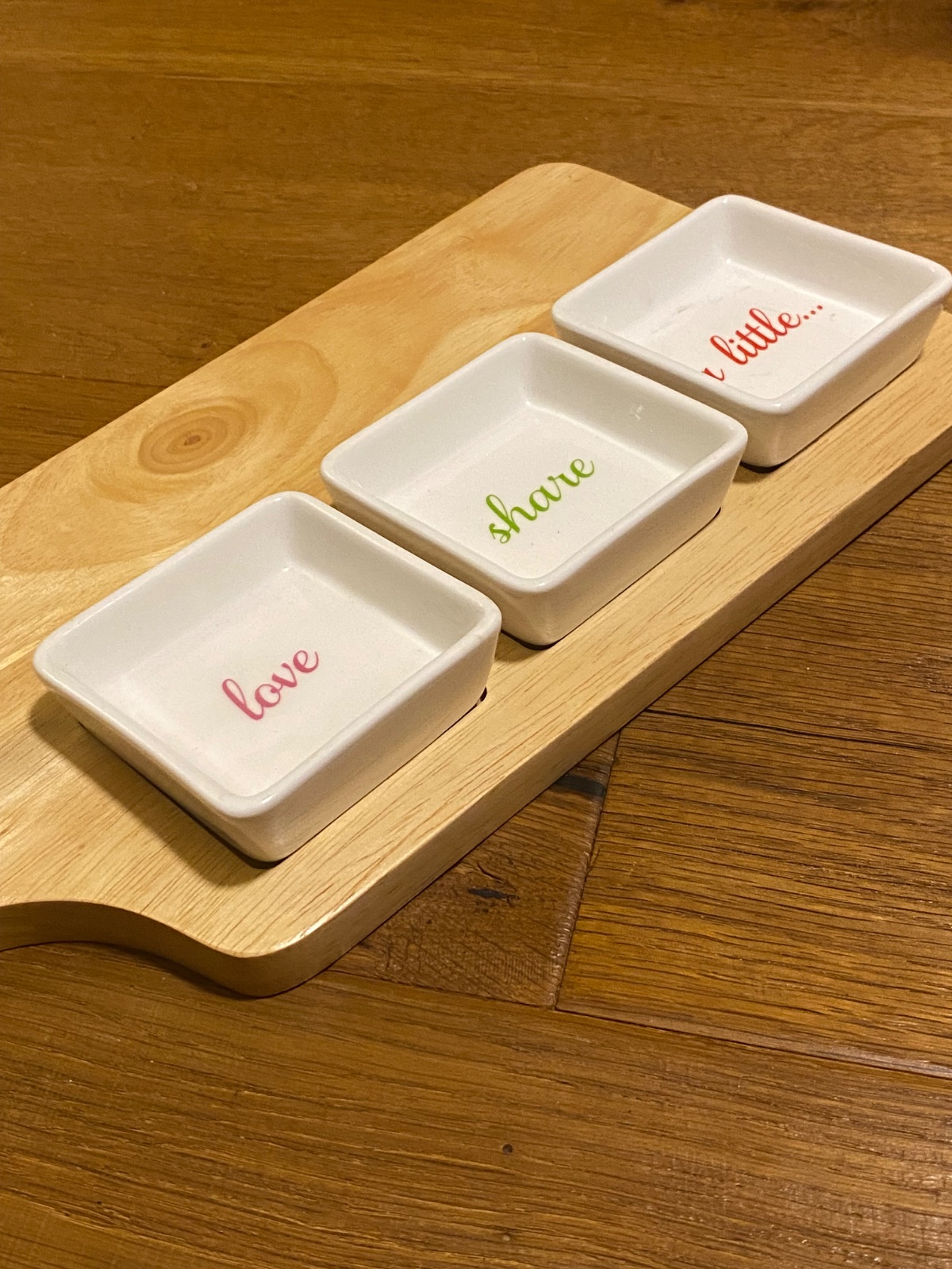 3x porcelánové misky s nápismi „love“, „share“ a „a little” umiestnené na praktickom podnose vyrobenom z dreva.