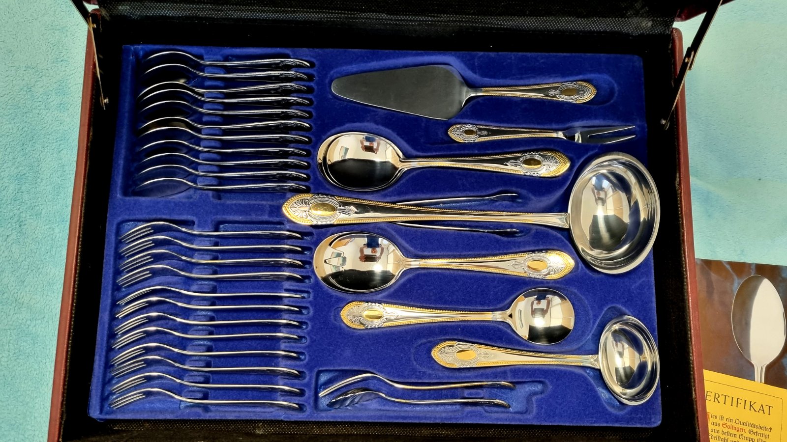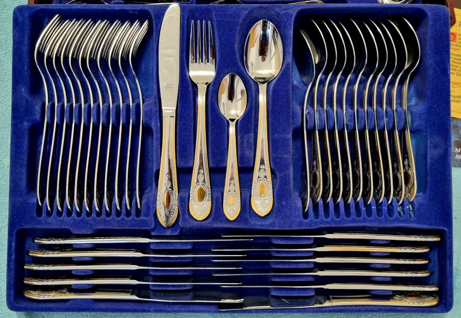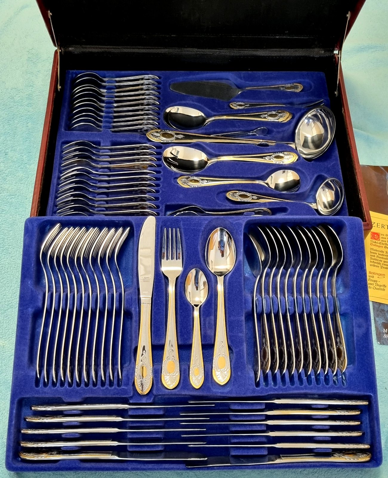 Predám 72ks kompletnú sadu príborov pre 12 osoby značky SBS Solingen Nemecko, model Toscana Royal. Je to luxusný model z 90 rokov od SBS Solingenu, ako nový s výroby. Kvalitný príbor je vyrobený s vysokokvalitnej nehrdzavejúcej ocele Cromargan 18/10, pozlátený 23/24 karátovým zlatom. Zlatá porcelánová obedová súprava by s týmto príborom dosiahla maximu luxusu. Je vhodný aj ako darček. Na spôsobe dodania sa vieme dohodnúť. Pozrite aj moje ďalšie inzeráty stačí dať vyhľadať moje tel. číslo, mám toho viac.