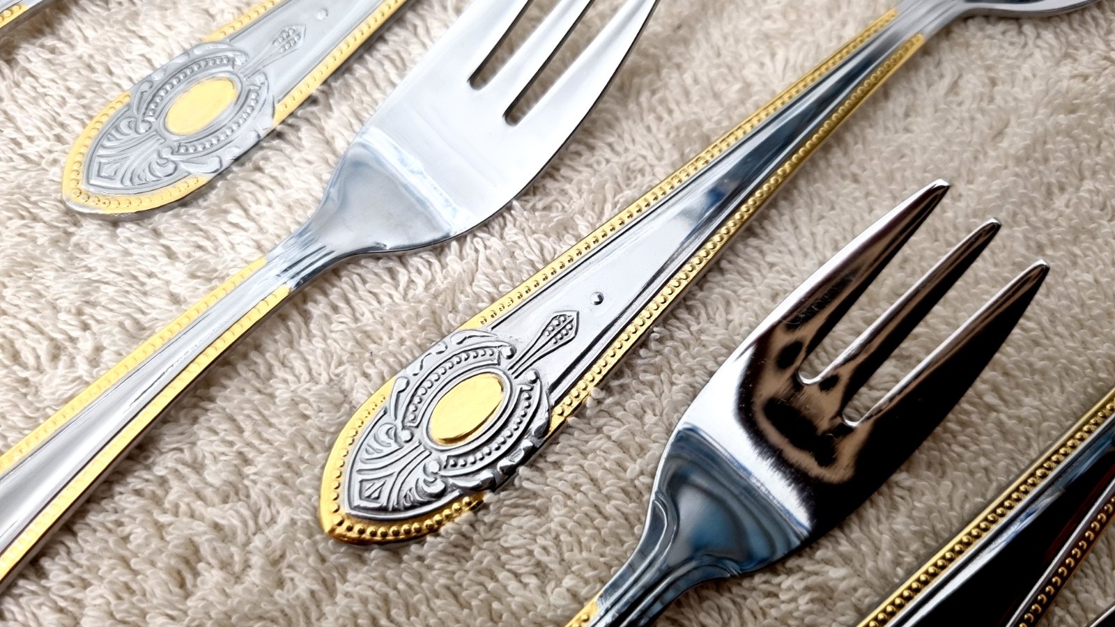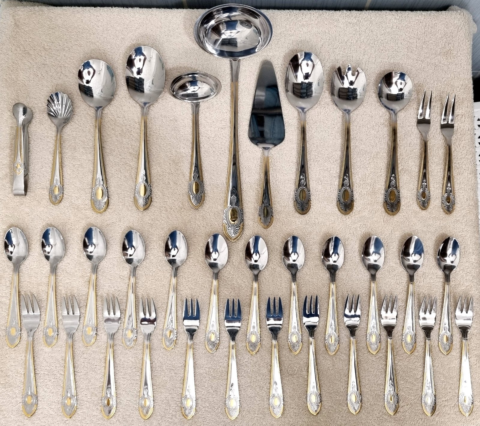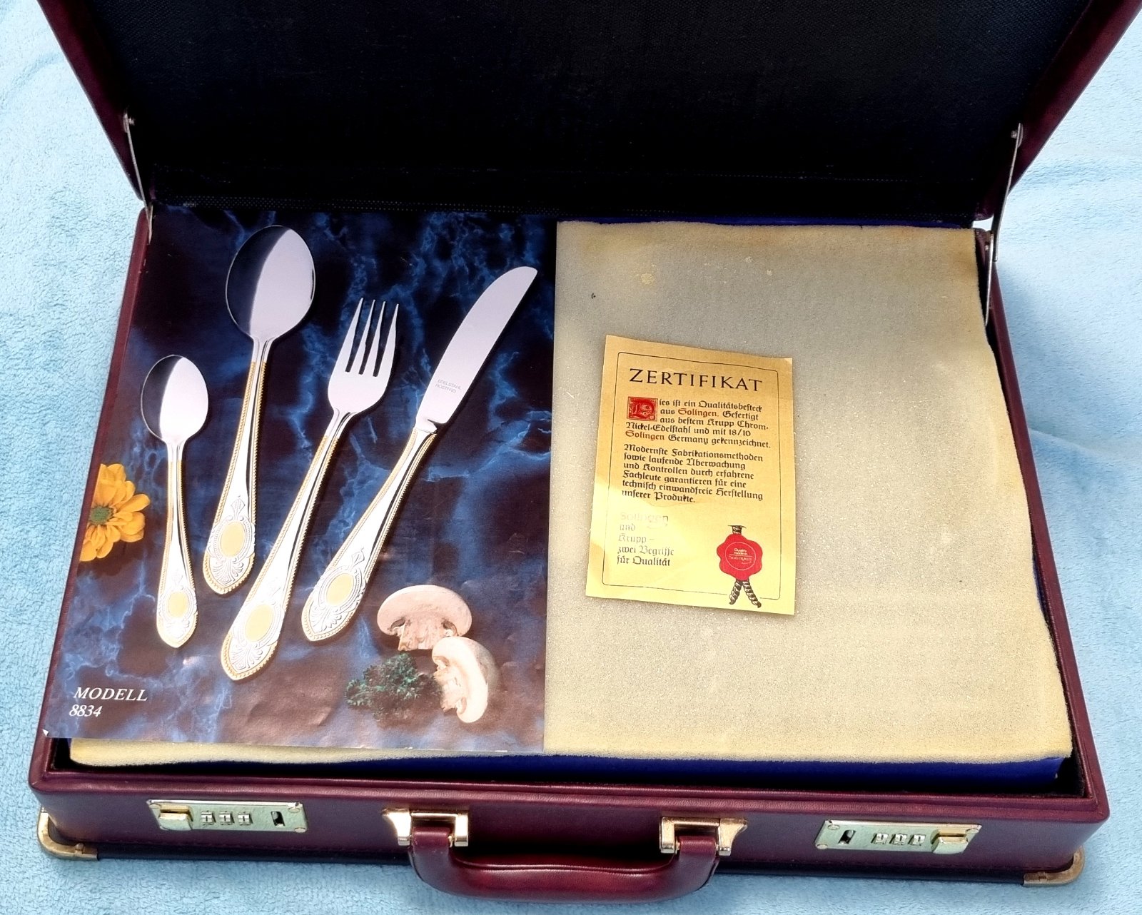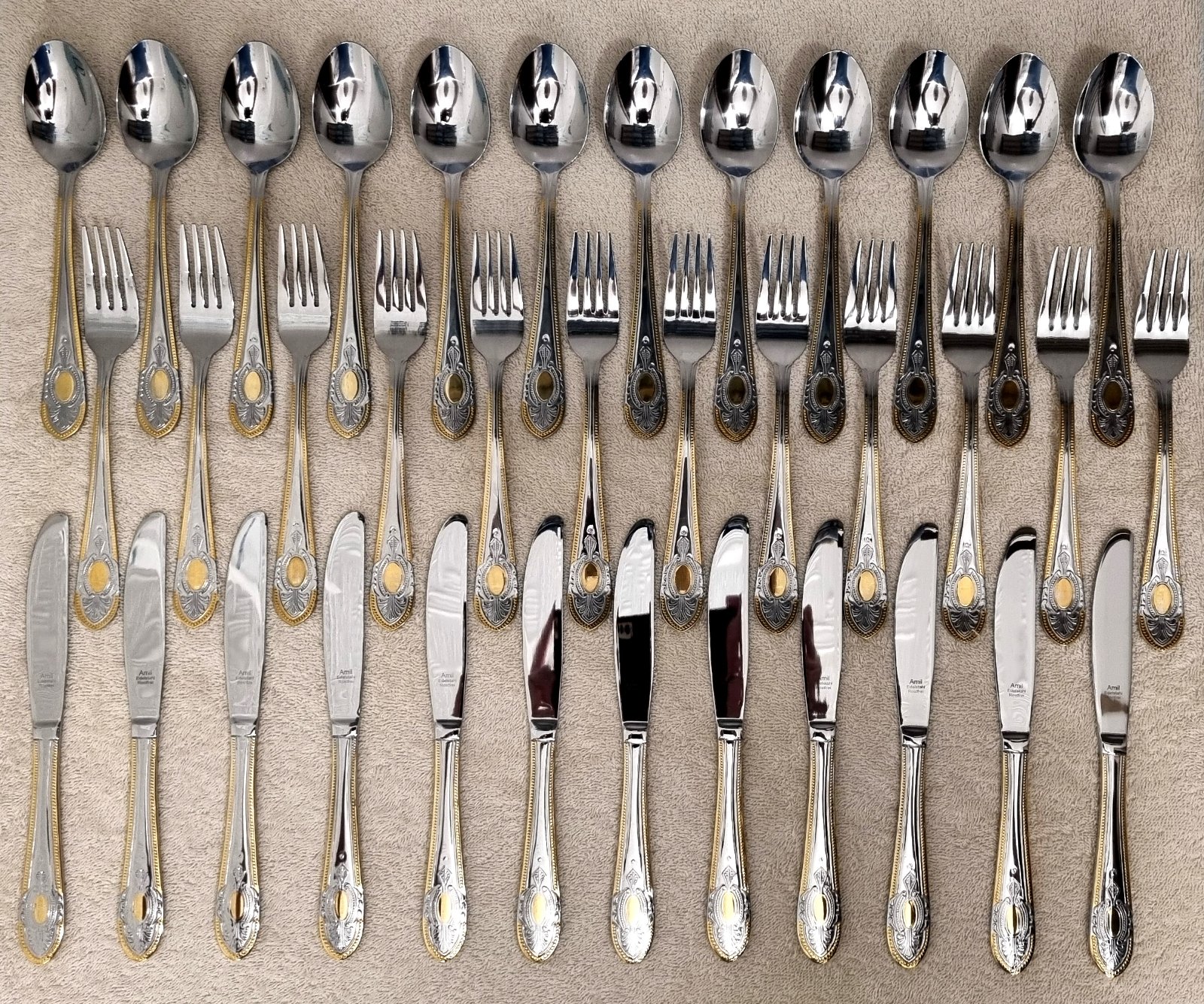Predám 72ks kompletnú sadu príborov pre 12 osoby značky SBS Solingen Nemecko, model Toscana Royal. Je to luxusný model z 90 rokov od SBS Solingenu, ako nový s výroby. Kvalitný príbor je vyrobený s vysokokvalitnej nehrdzavejúcej ocele Cromargan 18/10, pozlátený 23/24 karátovým zlatom. Zlatá porcelánová obedová súprava by s týmto príborom dosiahla maximu luxusu. Je vhodný aj ako darček. Na spôsobe dodania sa vieme dohodnúť. Pozrite aj moje ďalšie inzeráty stačí dať vyhľadať moje tel. číslo, mám toho viac.