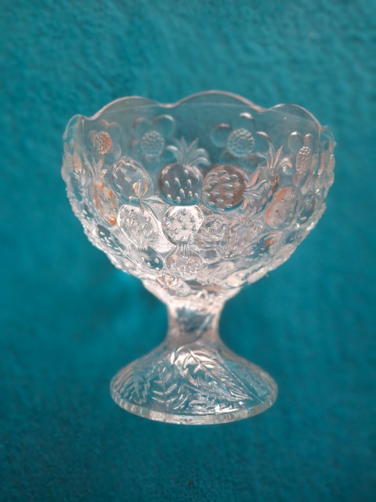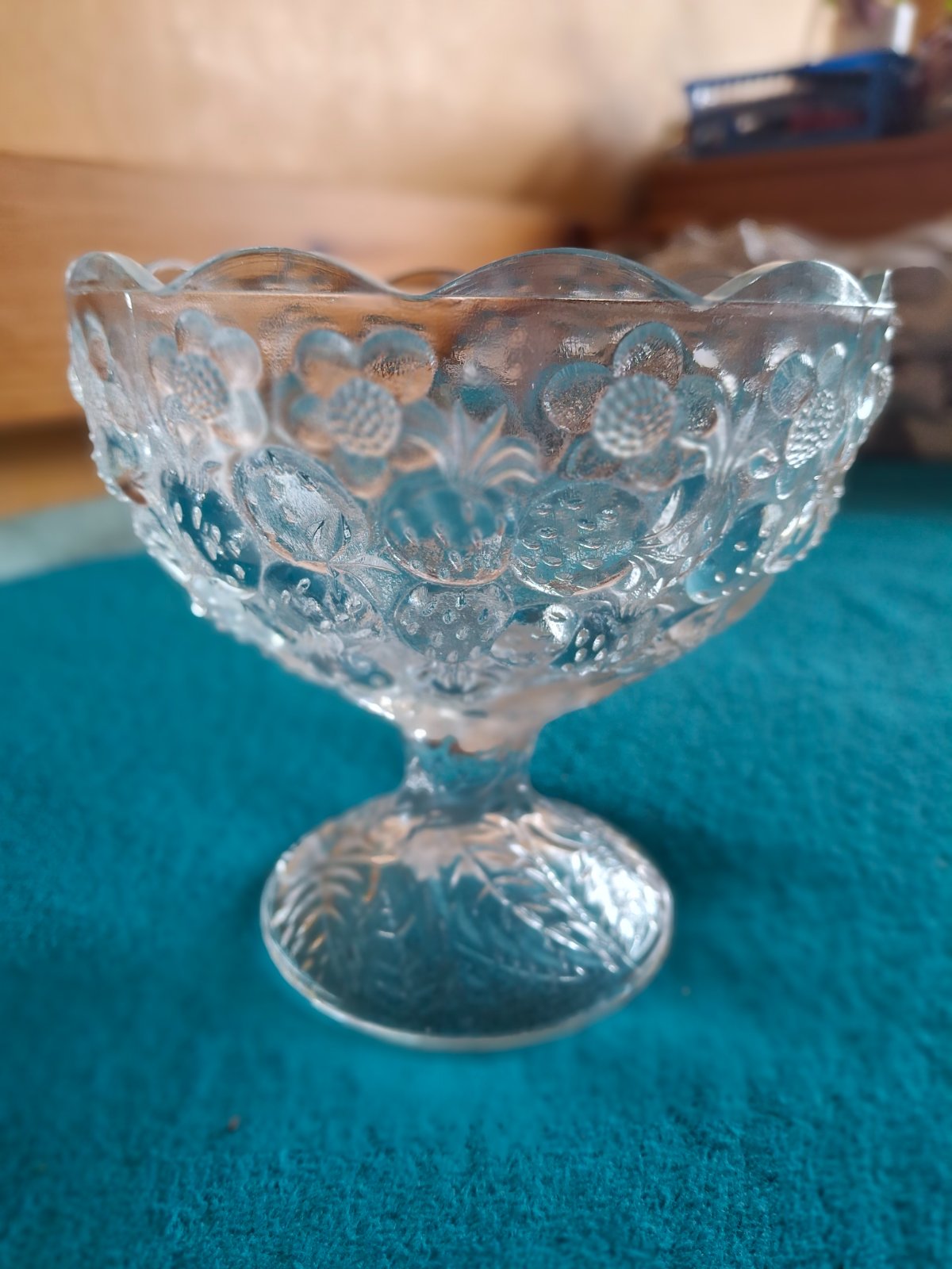 Hrubá sklenená miska na stopke objem cca 6dl vysoká 13 cm priemer cca 13,5 cm. Vhodná na oriešky, susienky alebo mega porciu pudingu napr.