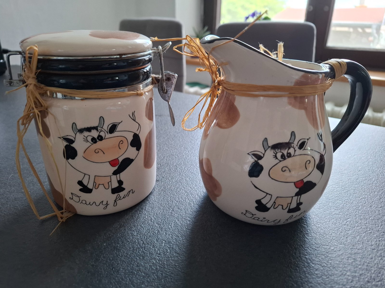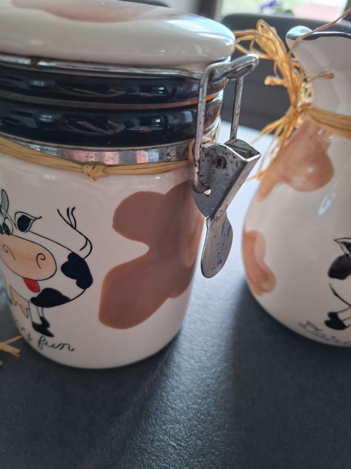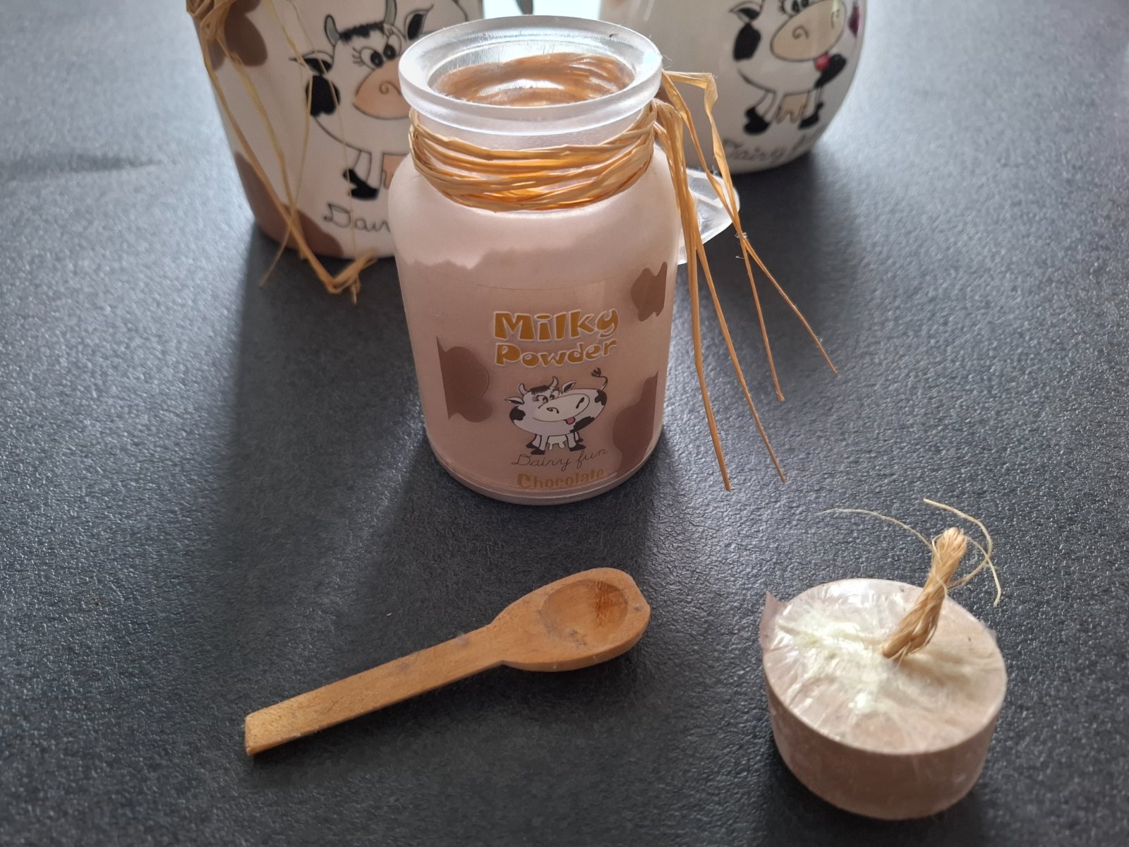 Set na kávu, čaj, mlieko, cukor či med. Bola v tom soľ do kúpeľa ale prázdne to ma iné využitie. Je to keramické, najmenšia nádobka s lyžičkou je sklenená. Nedostatky odfotene, špagat sa da dat dole. Cena spolu.