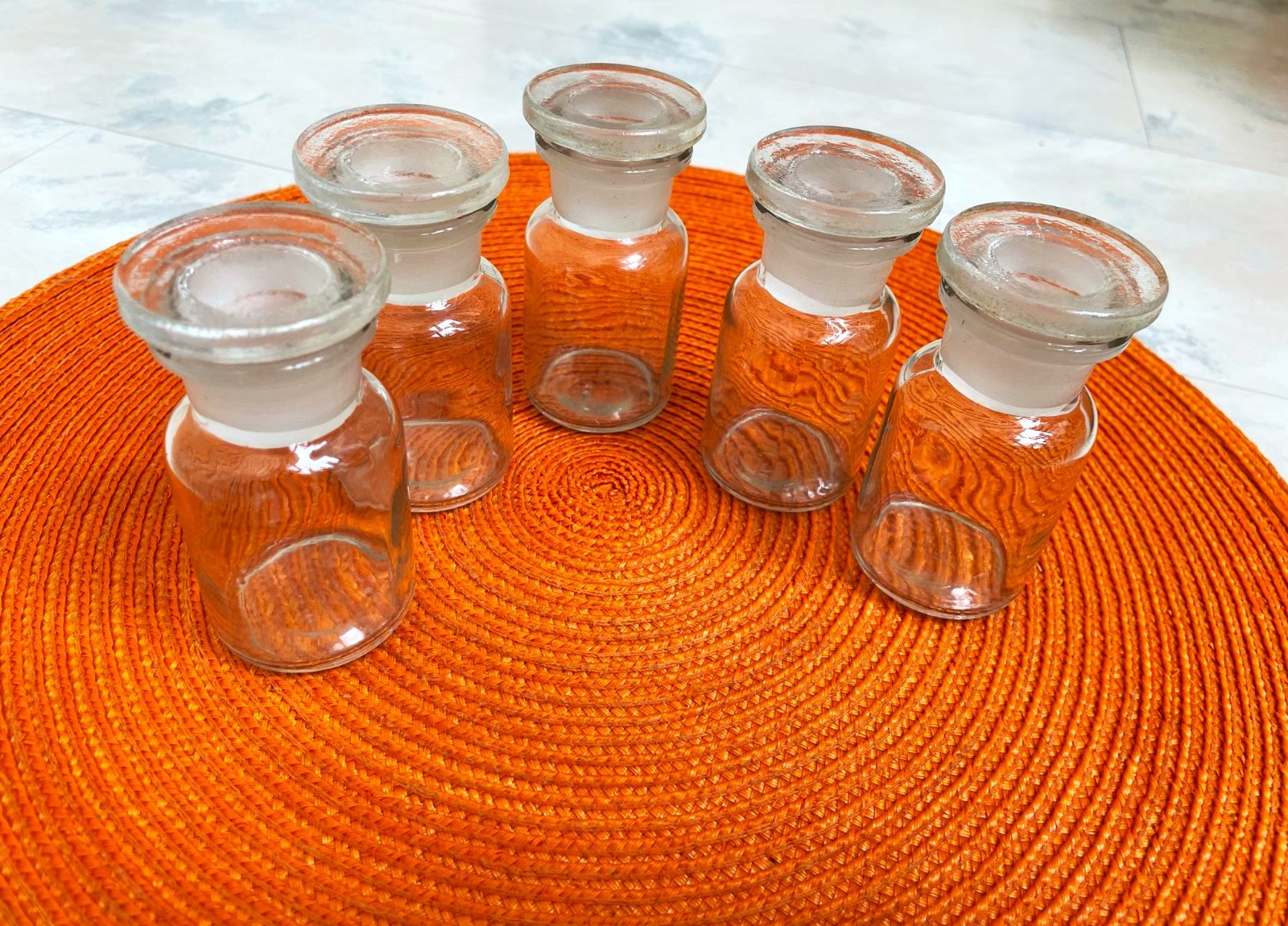 staré, sklenené,1. veľká - 1 ks : výška = 10 cm, priemer vrchu = 5,5 cm
