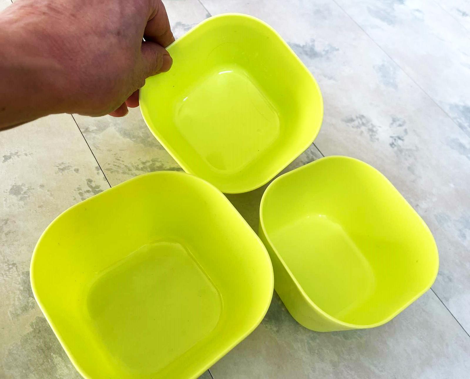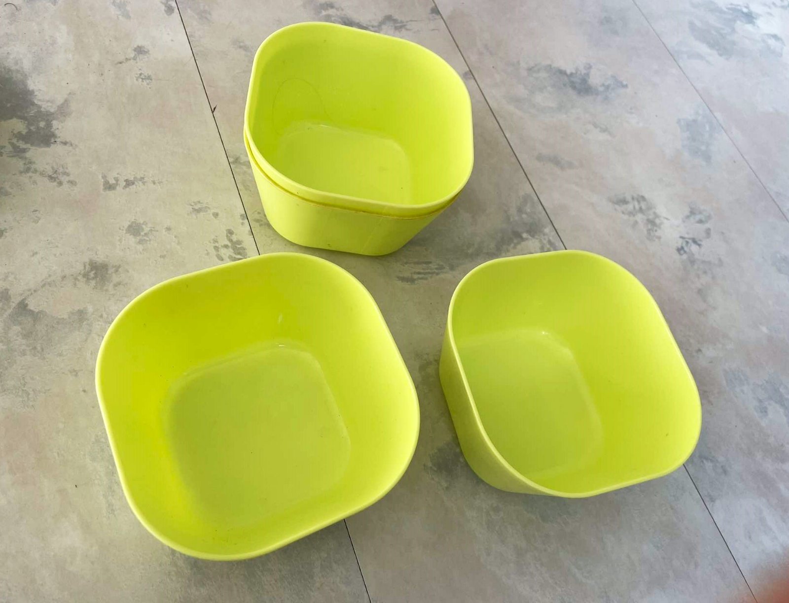 Plastové mištičky na kompót 4ks - 12 x 12 cm,výška 7 cm,krásna letná pestrá zeleno- žltá farba,vytvrdený plast