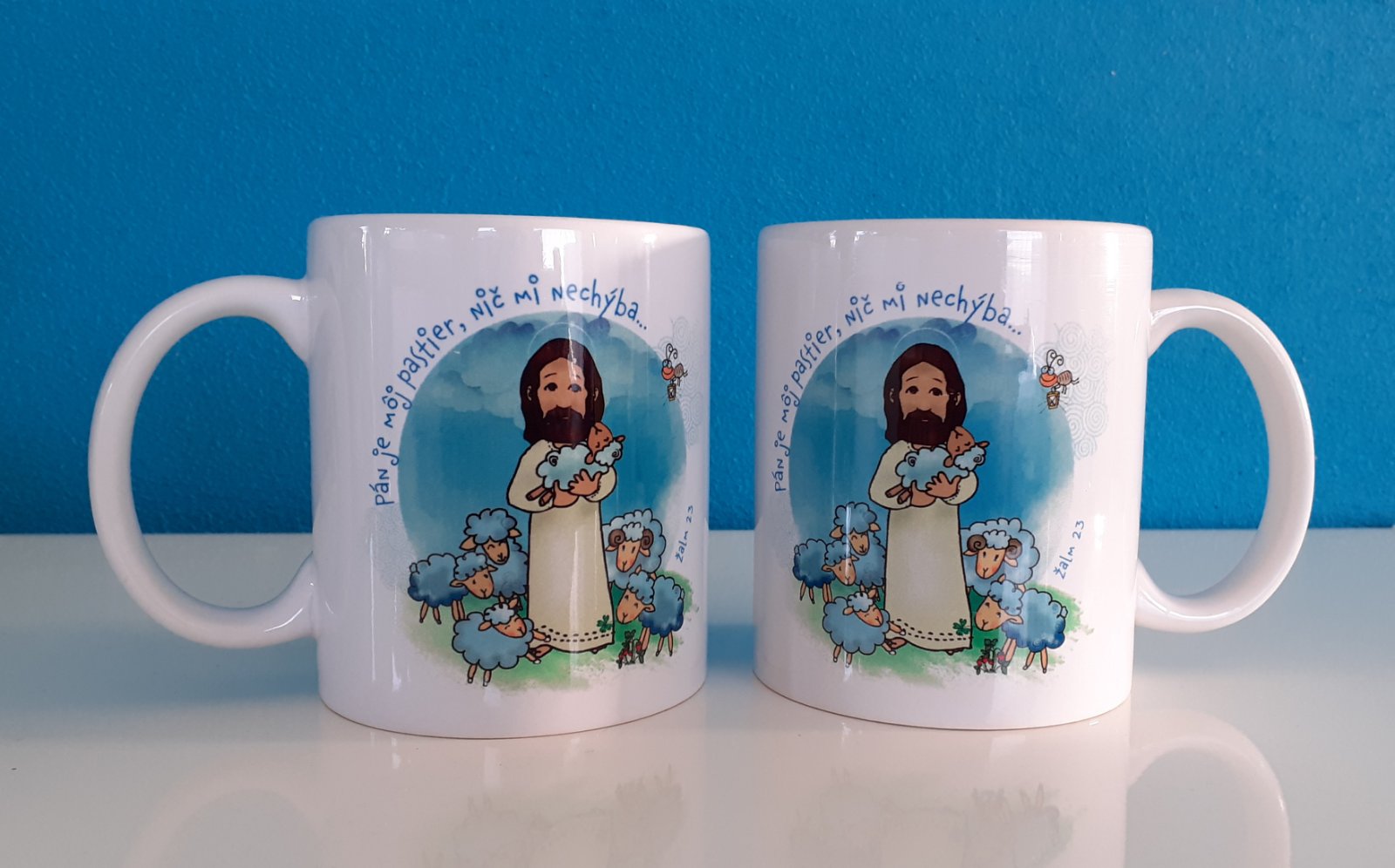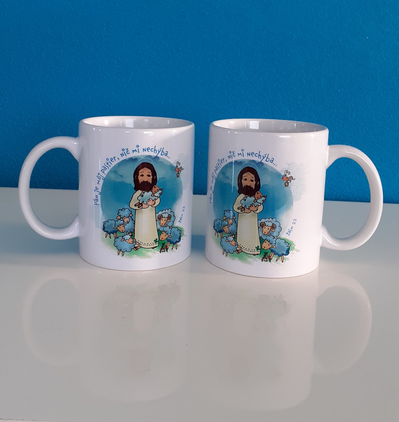 ☕ Biely hrnček s farebným kresleným motívom Pána Ježiša - Dobrého pastiera s ovečkami. Na hrnčeku je aj biblický citát: „Pán je môj pastier, nič mi nechýba...“ (Ž 23, 1)