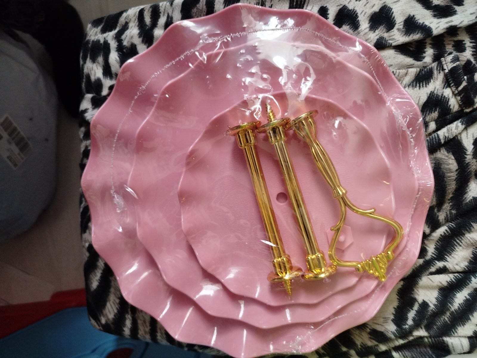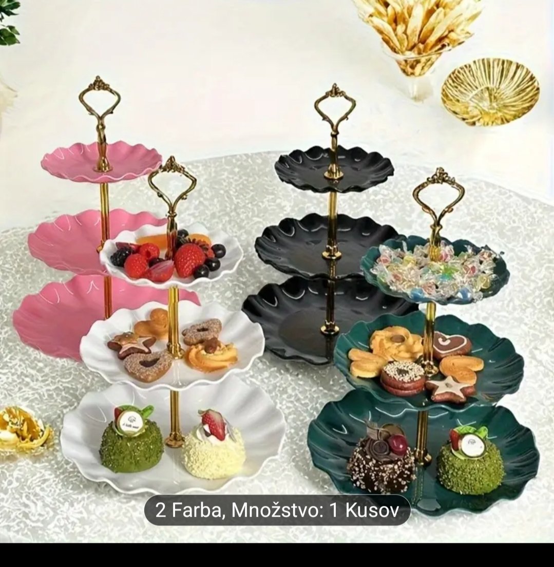 Plastový 3-poschodový etažér na zákusky či iné pohostenie, s ozdobným vlnkovitým efektom na koncoch tanierov, čisto nové, nerozbalené, v ružovej a v bielej farbe. Rozmery na foto. Cena za 1 ks 3 eur, pri kúpe oboch cena spolu 5 eur.