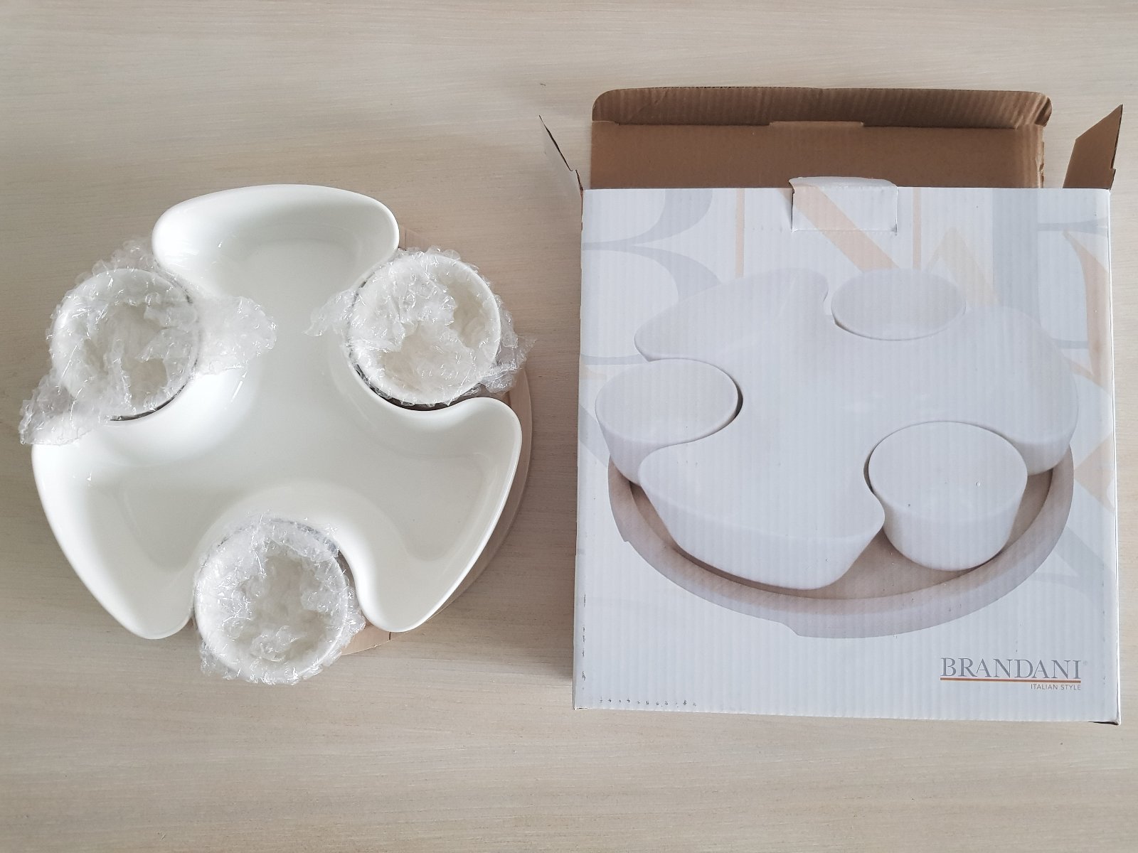 Predám porcelánovú servírovaciu sadu misiek na bambusovom podnose o priemere 22 cm. Talianska značka Brandani. Úplne nové, nepoužité, v originálnom balení.