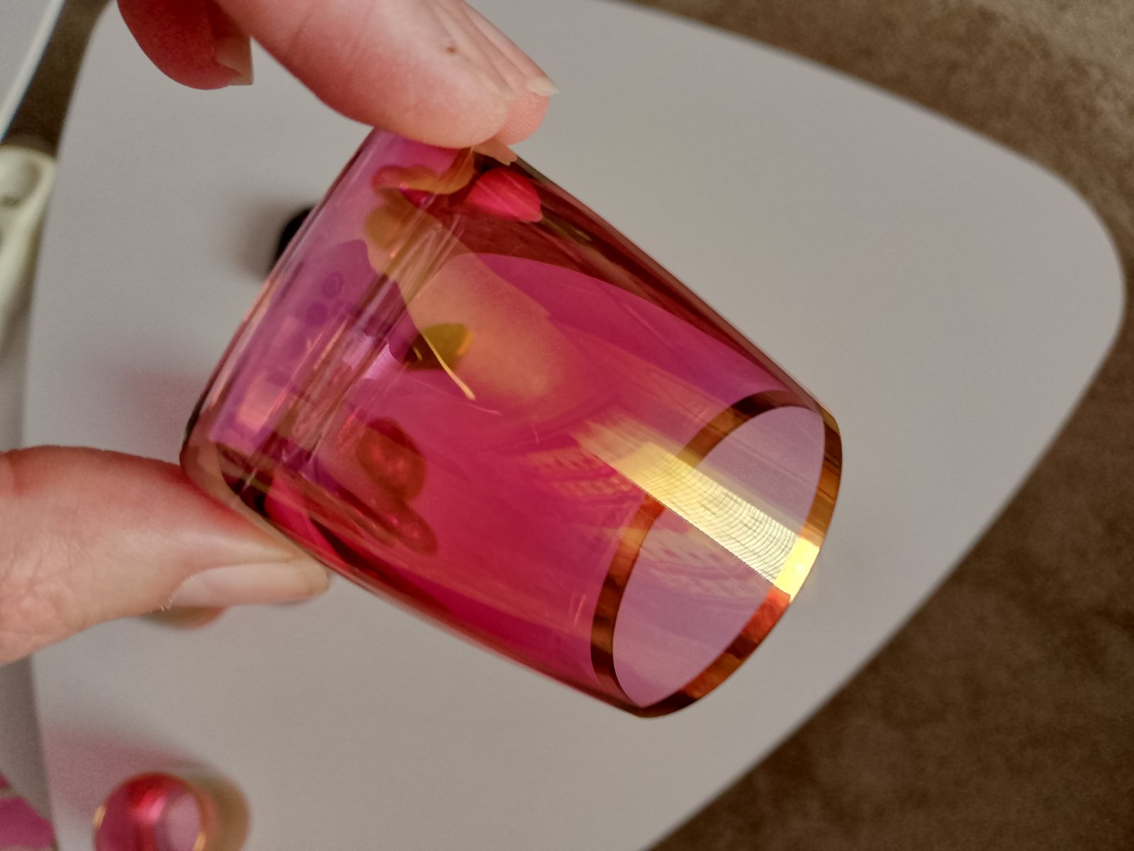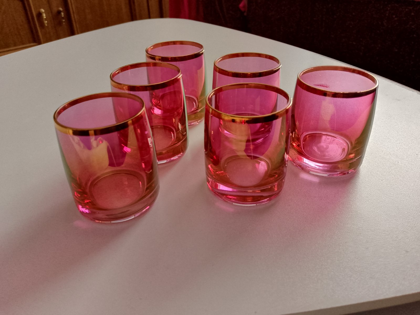 Predam tieto krasne pohare bez poskodenia vhodne ako dar. Sklo je dymove a ornamenty rucne malovane. Okolo zlata obruba