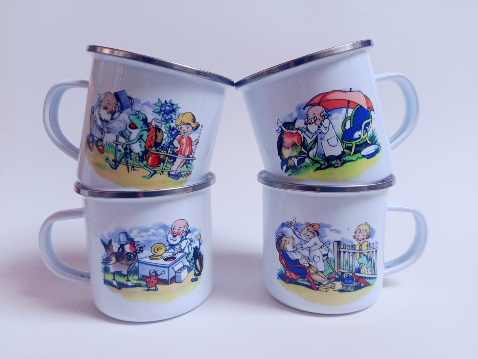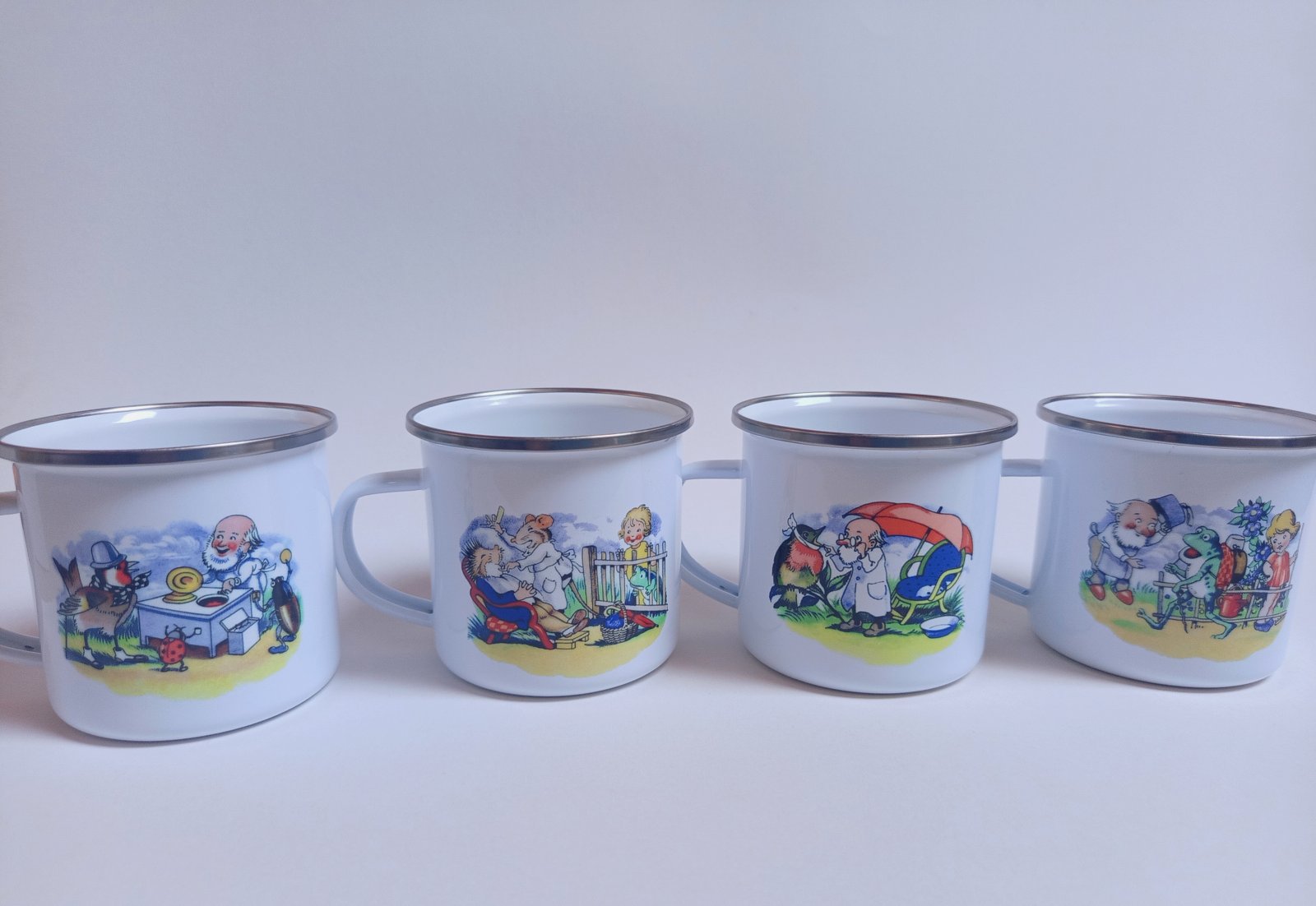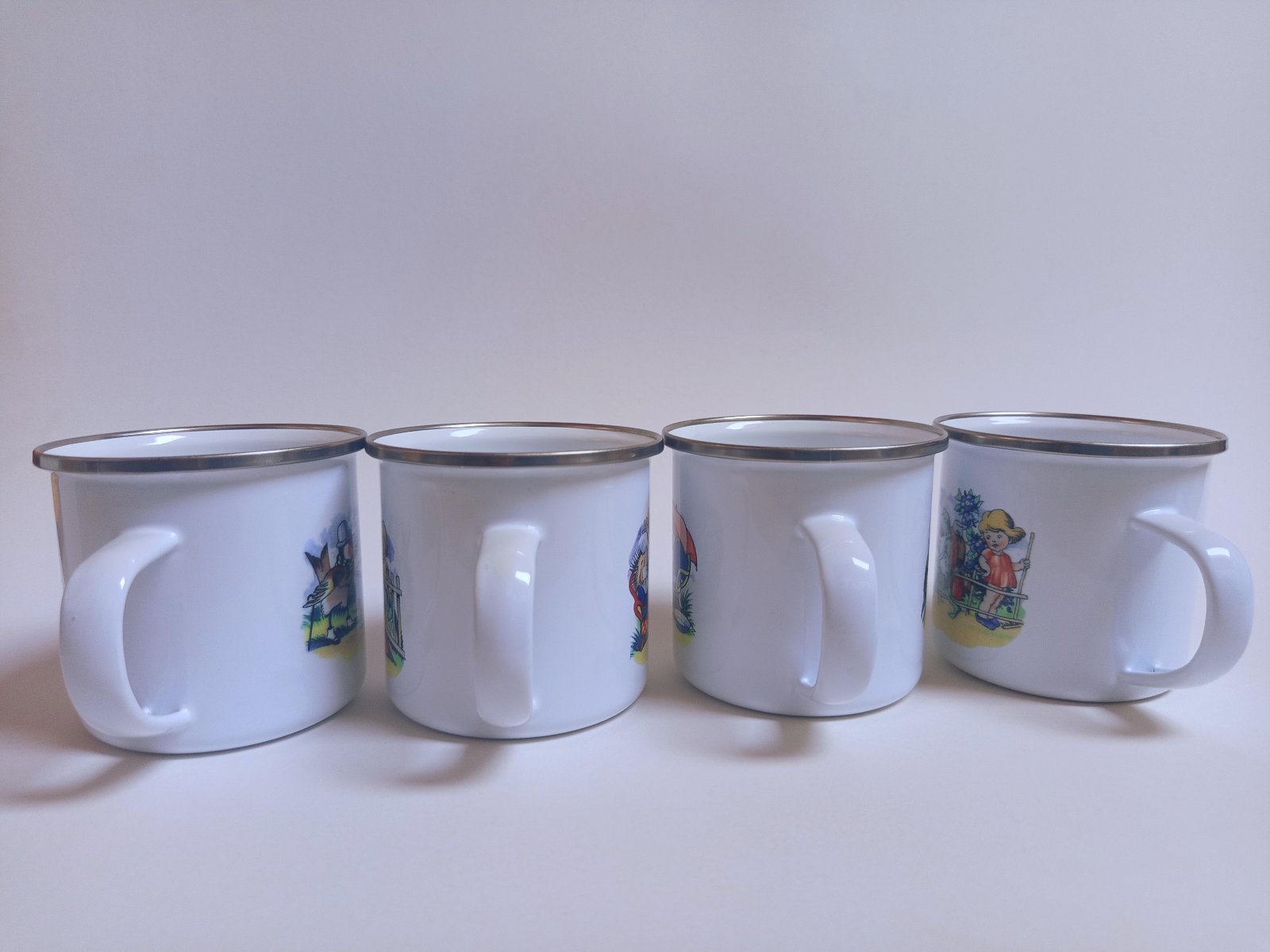 Ponúkam na predaj 4 ks nových smaltovaných hrnčekov s krásnymi detskými retro obrázkami. Na každom hrnčeku je rovnaký obrázok z oboch strán. Hrnčeky sú nové, nepoužívané a v pôvodnom balení, ideálne na kempovanie, do chalupy alebo ako štýlový doplnok do domácnosti.