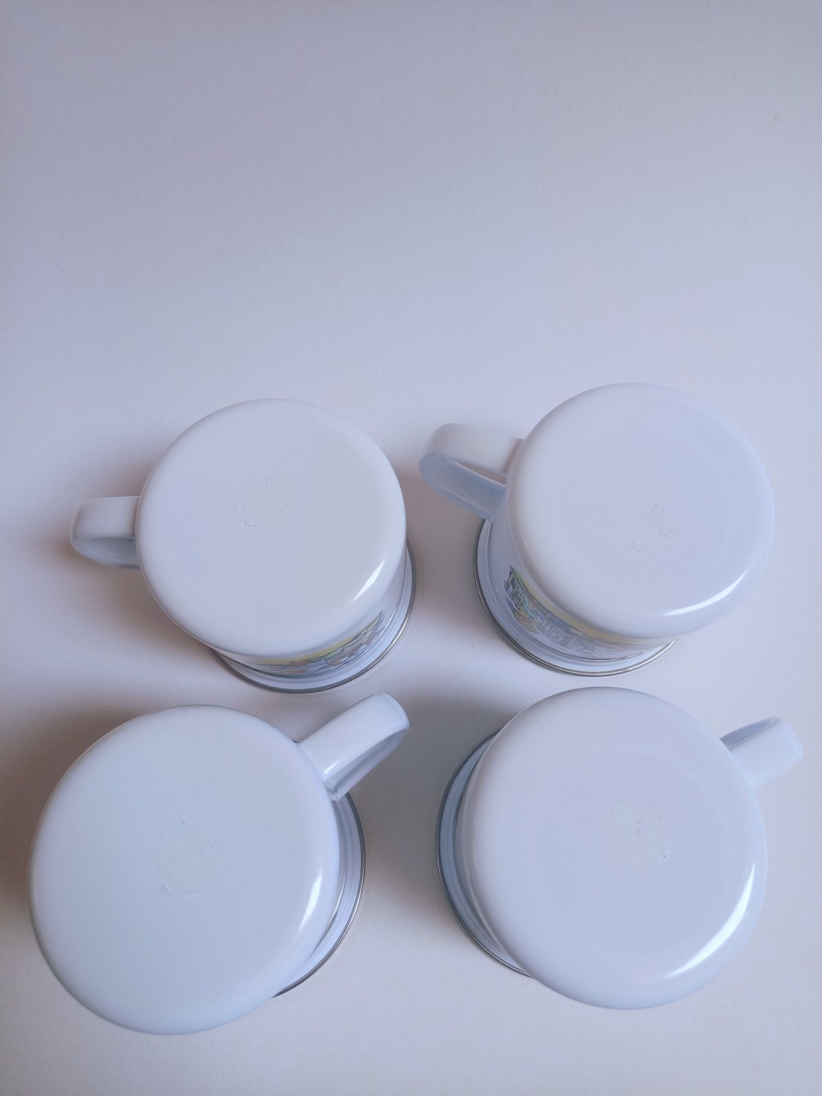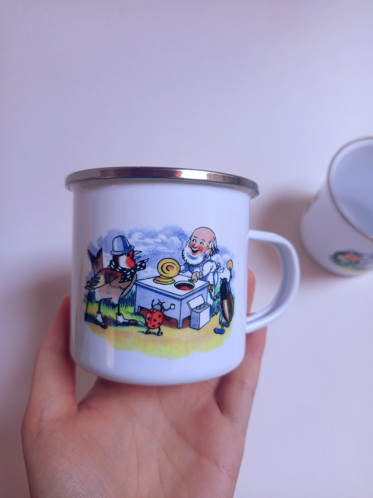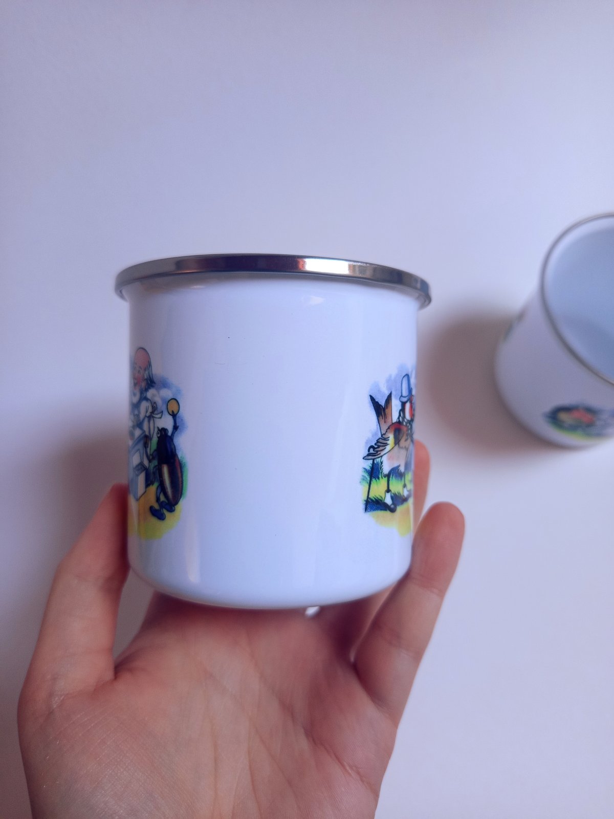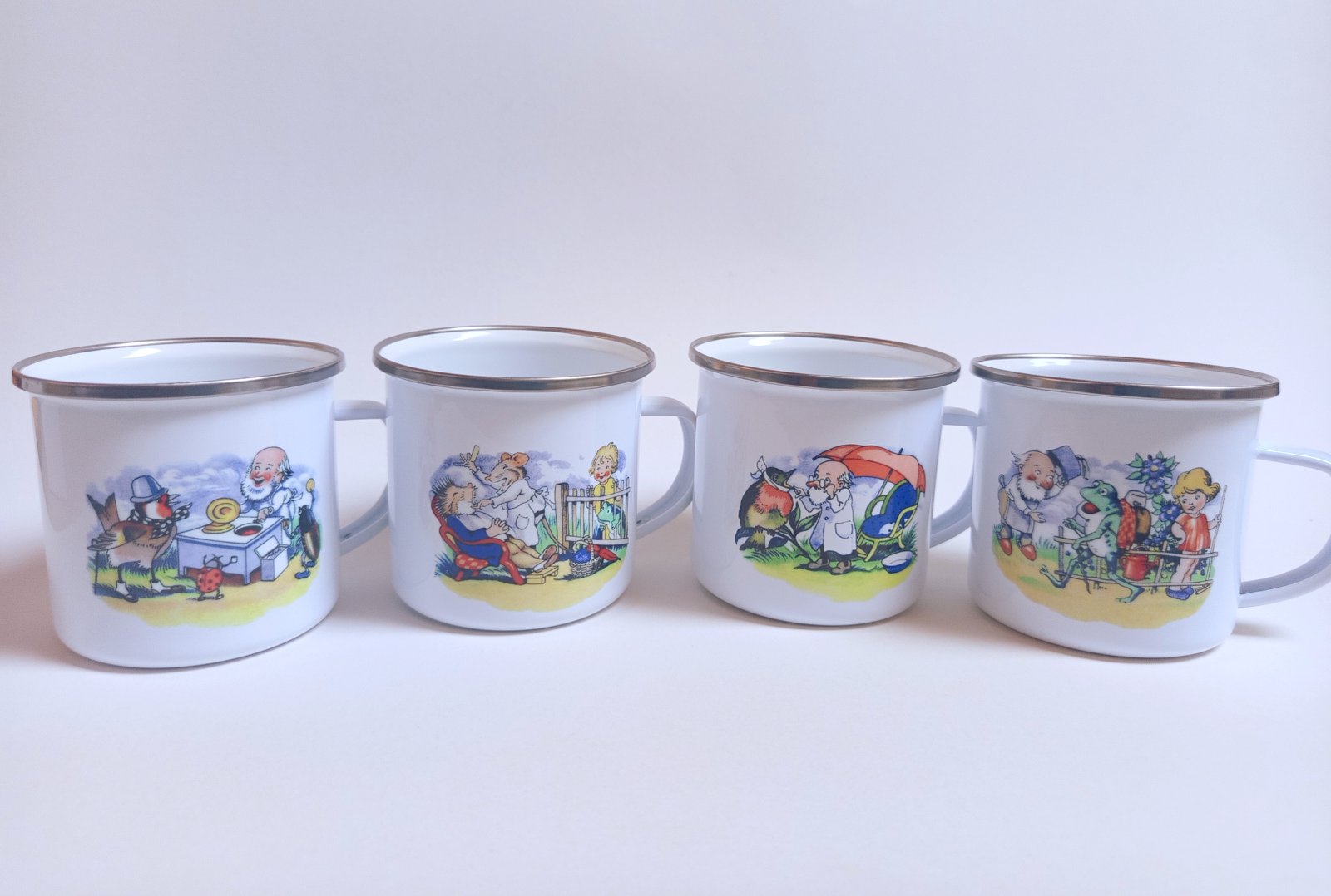 Ponúkam na predaj 4 ks nových smaltovaných hrnčekov s krásnymi detskými retro obrázkami. Na každom hrnčeku je rovnaký obrázok z oboch strán. Hrnčeky sú nové, nepoužívané a v pôvodnom balení, ideálne na kempovanie, do chalupy alebo ako štýlový doplnok do domácnosti.