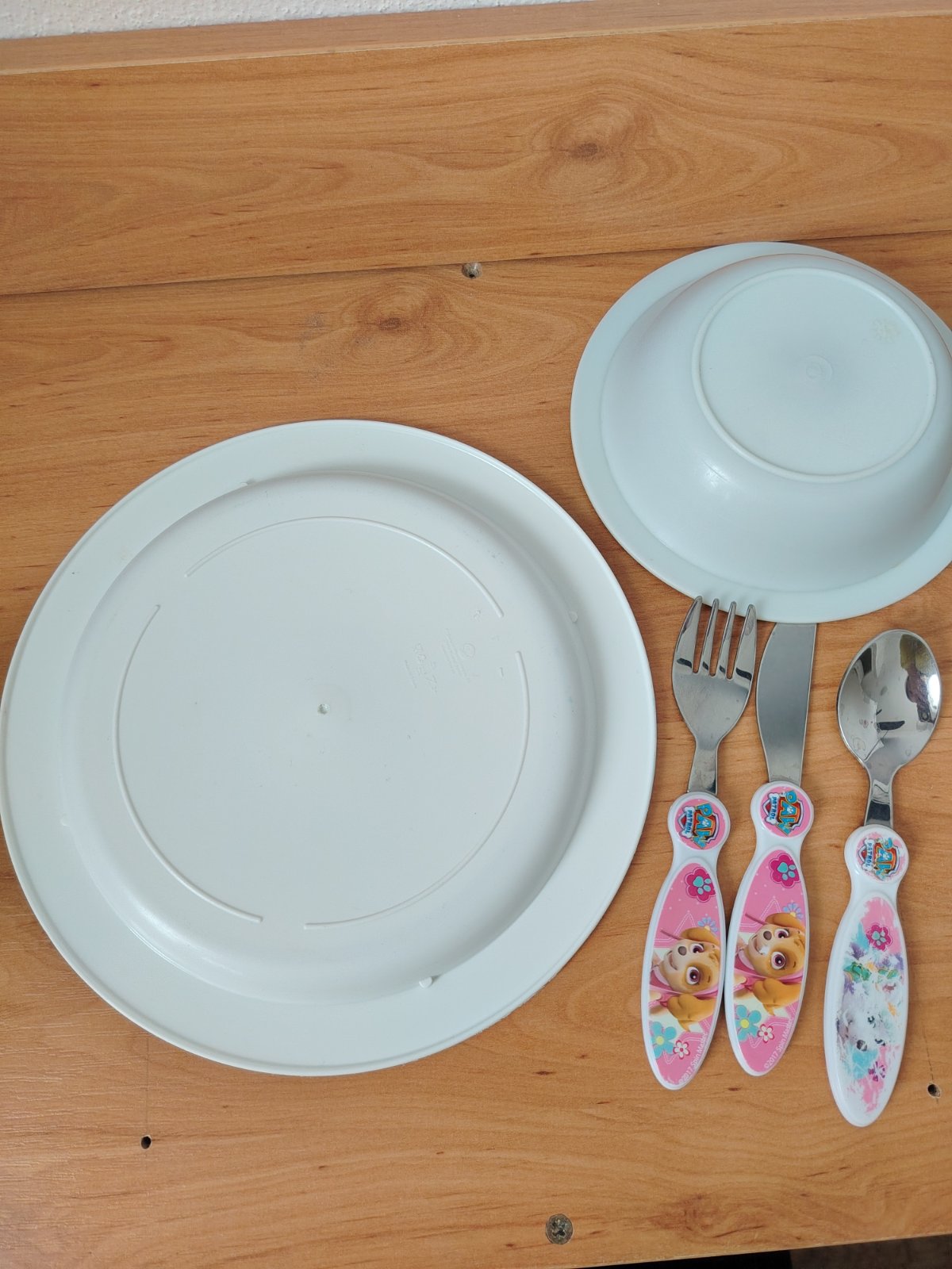 Známky používania na plastovom tanieriku a plastovej časti príboroch.