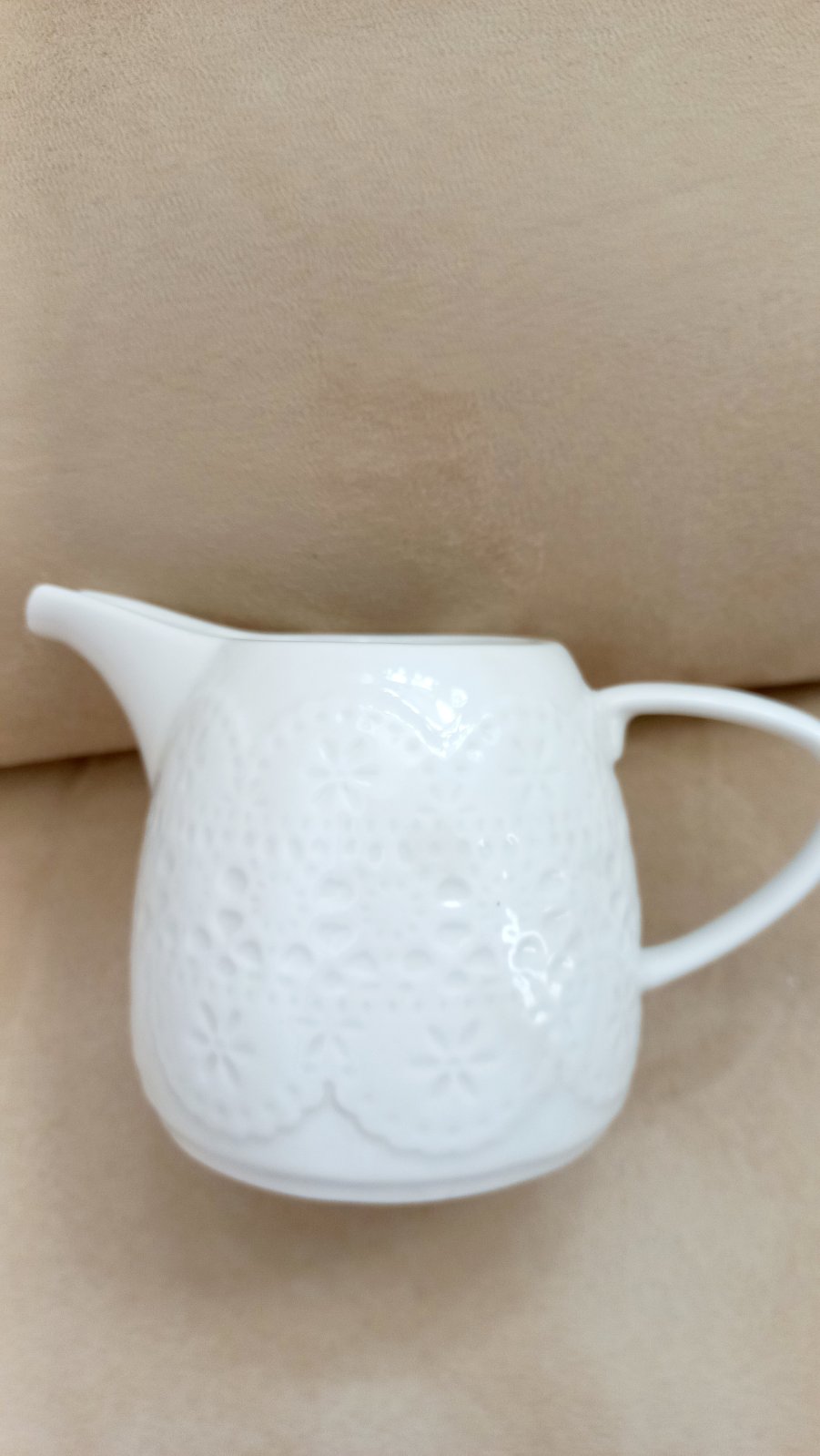 Nádoba na servírovanie mlieka. Vzor ako čipka. Jemný a decentný dizajn. Objem 250 ml. Celkom po vrch je 300 ml. Vhodný aj na omáčky, čaj, kávičku. Zn: AFFEK DESIGN