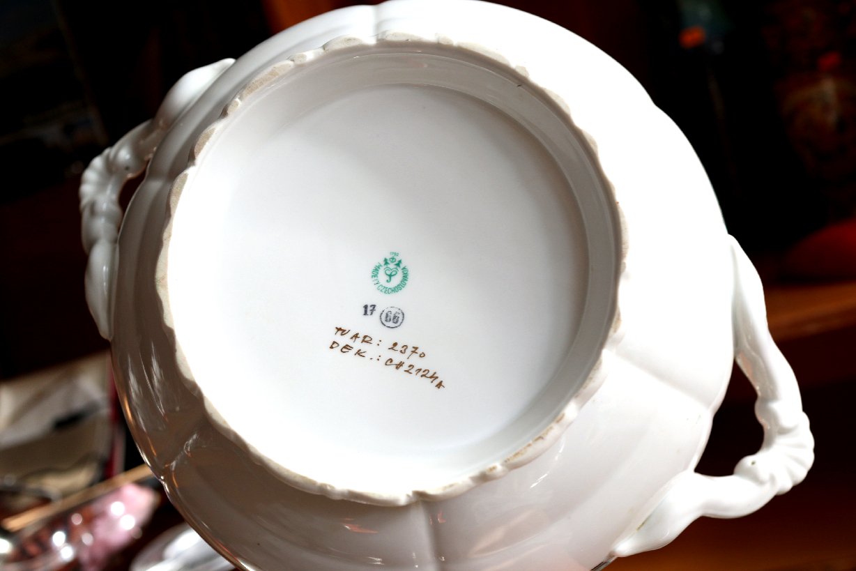 Značená obedová súprava so zlatozeleným bohatým dekorom, Made in Cechoslovakia, výrobňa Horní Slavkov.