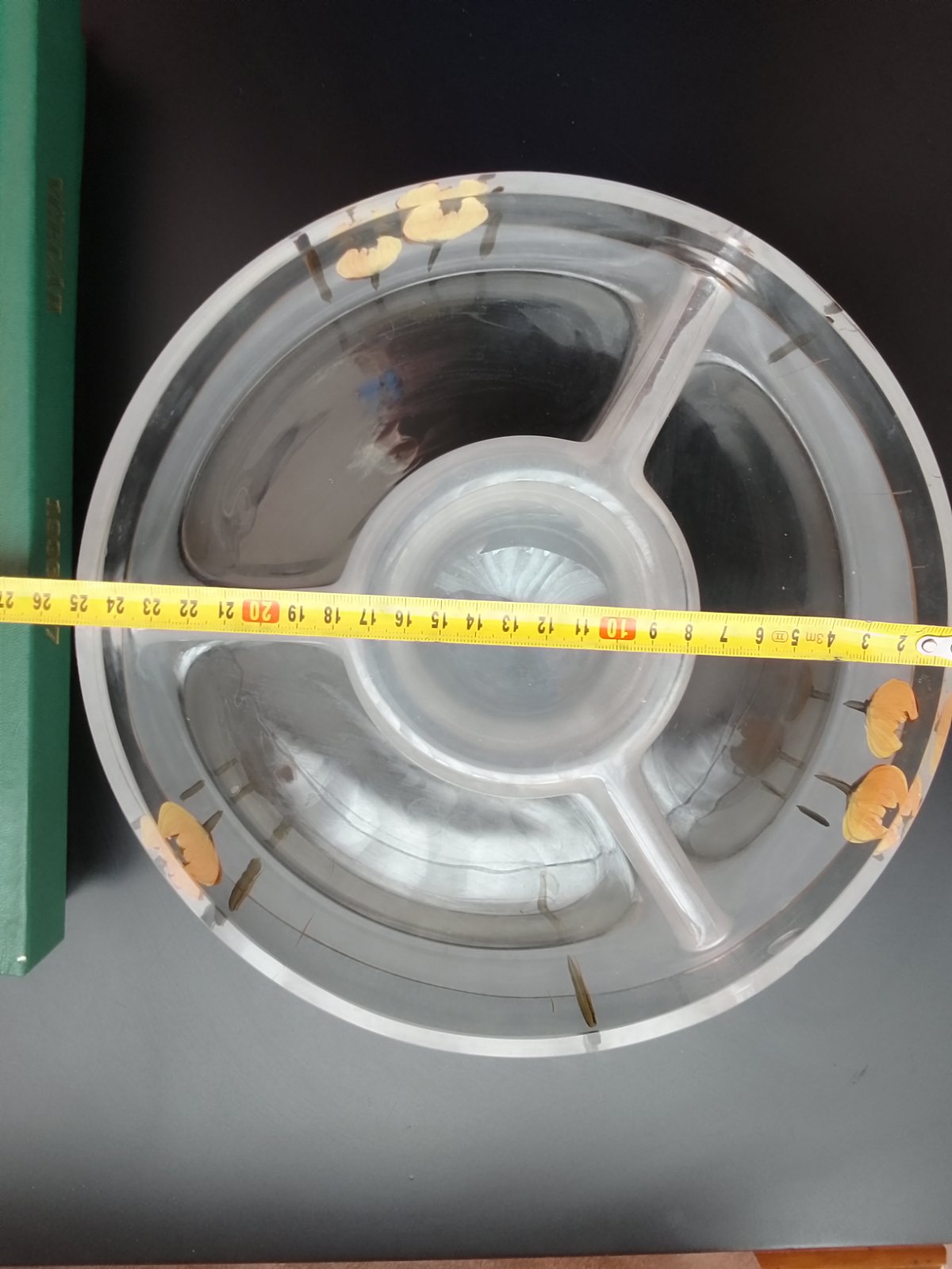 Predám veľmi peknù misu z masívneho skla, výška 7,5cm, je rozdelená na tri časti a stred. Na jednej strane je trochu poškodená, ani to nevidno/vid.fotka/, inak v dobrom stave. Cena 9,00 eur+ poštovné.