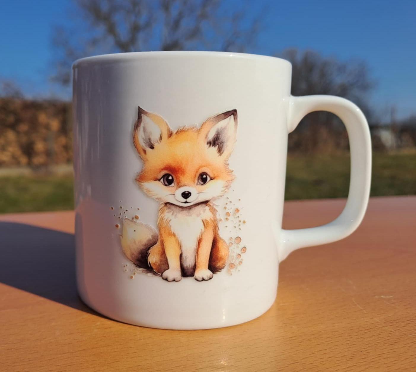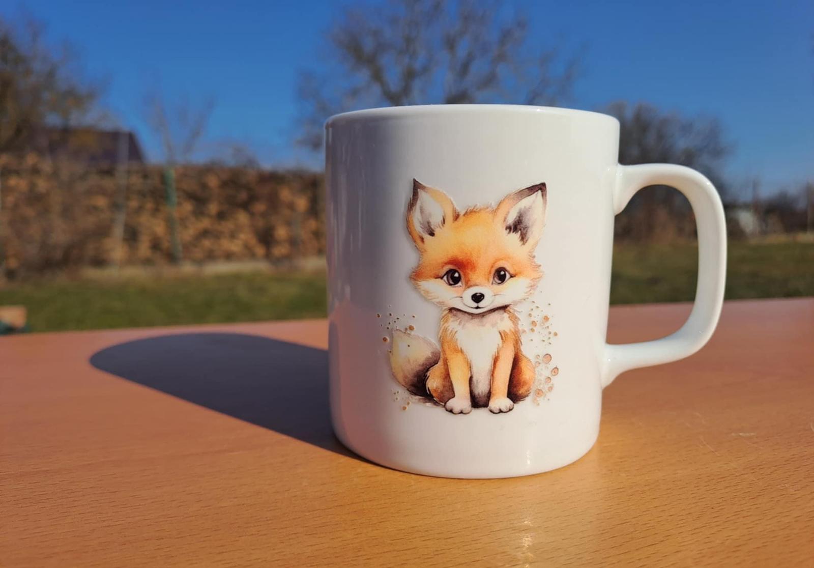 Originálny biely porcelánový hrnček s motívom roztomilej líšky.