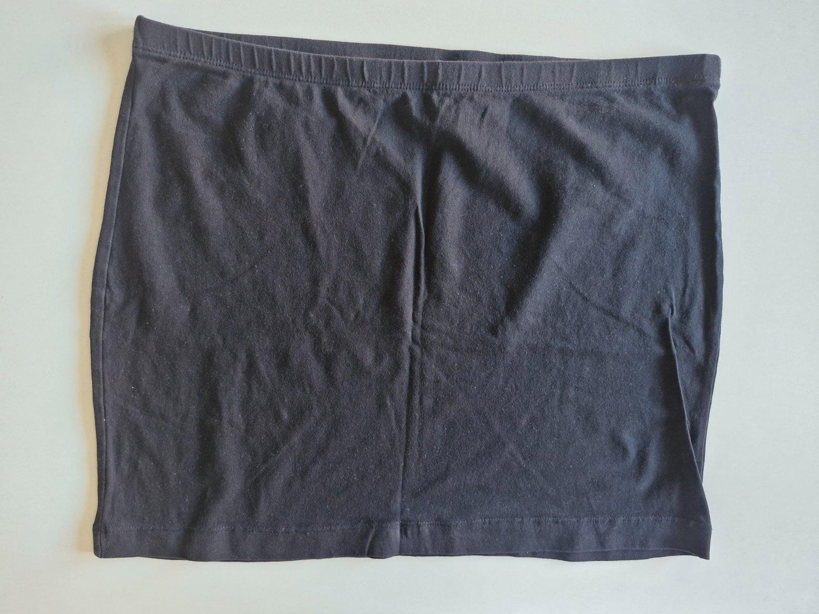 Čierna elastická úpletová sukňa s gumou v páse, veľkosť L. Materiál sukne je elastický, zloženie: 96% bavlna, 4% elastan. Miery pas: 2x42-50cm dĺžka: 45,5cm